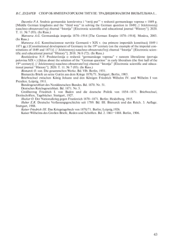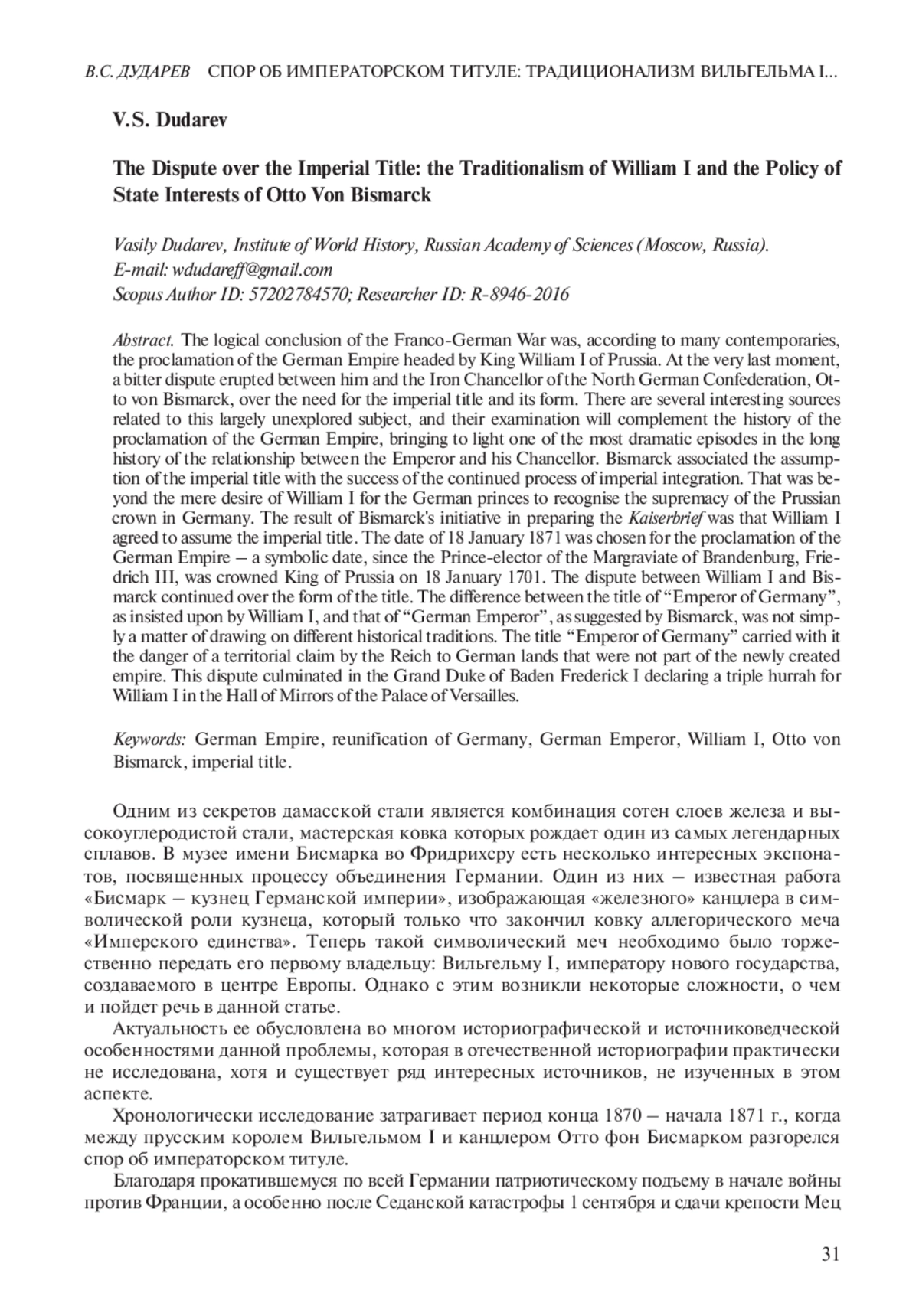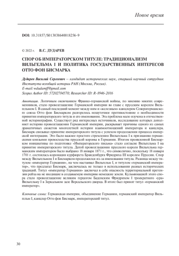 ДУДАРЕВ В. С. СПОР ОБ ИМПЕРАТОРСКОМ ТИТУЛЕ: ТРАДИЦИОНАЛИЗМ ВИЛЬГЕЛЬМА I И ПОЛИТИКА ГОСУДАРСТВЕННЫХ ИНТЕРЕСОВ ОТТО ФОН БИСМАРКА // НОВАЯ И НОВЕЙШАЯ ИСТОРИЯ. 2022. № 1