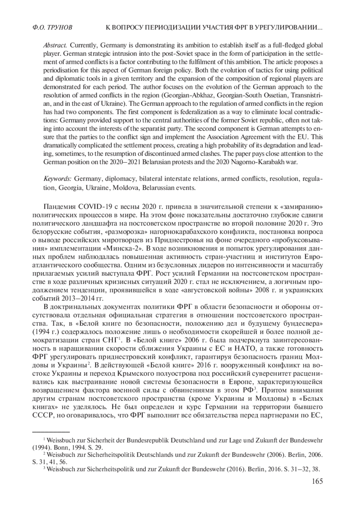 ТРУНОВ Ф. О. К ВОПРОСУ ПЕРИОДИЗАЦИИ УЧАСТИЯ ФРГ В УРЕГУЛИРОВАНИИ ВООРУЖЕННЫХ КОНФЛИКТОВ НА ПОСТСОВЕТСКОМ ПРОСТРАНСТВЕ // НОВАЯ И НОВЕЙШАЯ ИСТОРИЯ. 2022. № 1