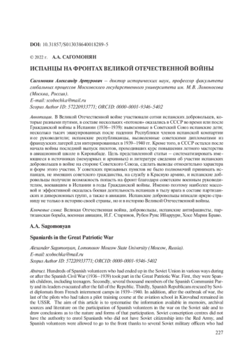 В Великой Отечественной войне участвовали сотни испанских добровольцев, которые разными путями, в составе нескольких «потоков» оказались в СССР во время или после Гражданской войны в Испании (1936–1939): вывезенные в Советский Союз испанские дети; несколько тысяч эвакуированных после падения Республики членов испанской компартии и ее руководители; испанские республиканцы, вызволенные советскими дипломатами из французских лагерей для интернированных в 1939–1940 гг. Кроме того, в СССР остался после начала войны последний выпуск пилотов, проходивших курс повышения летного мастерства в авиационной школе в Кировабаде. Цель представленной статьи – систематизировать имеющиеся в источниках (мемуарных и архивных) и литературе сведения об участии испанских добровольцев в войне на стороне Советского Союза, сделать выводы относительно характера и форм этого участия. У советских призывных пунктов не было полномочий принимать испанцев, не имевших советского гражданства, на службу в Красную армию, и испанские добровольцы получили возможность попасть на фронт благодаря советским военным руководителям, воевавшим в Испании в годы Гражданской войны. Именно поэтому наиболее массовой и эффективной оказалась боевая деятельность испанцев в тылу врага в составе партизанских и диверсионных групп, а также в авиации. Испанские добровольцы вписали яркую страницу не только в историю своей страны, но и в историю Великой Отечественной войны