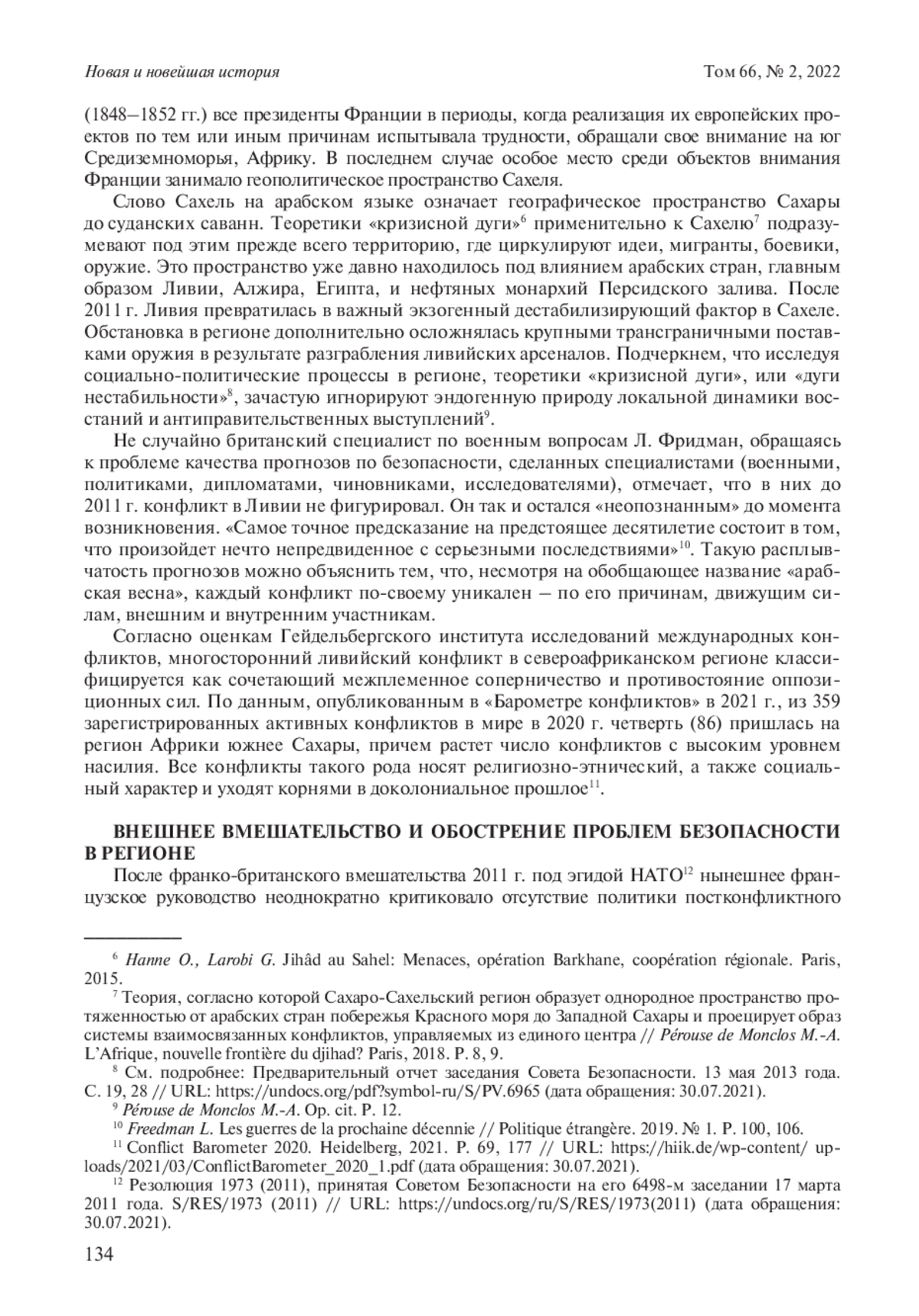 Исторически Ливия не входила в сферу интересов и влияния Франции, основу которых традиционно составляла франкоязычная Африка. После падения режима М. Каддафи в 2011 г. особое значение для Франции приобрели вопросы безопасности в странах СахароСахельского региона. Статью предваряет сжатый экскурс в историю франко-ливийского взаимодействия до и после падения режима Каддафи, когда ситуация внутри Ливии и на ее границах стала осложняться и превратилась в предмет растущей озабоченности в самой Франции и за ее пределами. Актуальность и новизна состоят в рассмотрении отношения Франции к ливийской проблематике в тесной увязке с силовым противодействием терроризму и обеспечением безопасности в странах Сахеля. Целью работы является анализ складывающейся в регионе ситуации, выявление мотивации и характера действий Франции в Ливии, вокруг Ливии и в контексте будущего постконфликтного урегулирования. При написании статьи на основе историко-генетического и историко-аналитического методов использованы отечественные и зарубежные монографии, статьи в научных журналах, официальные документы международных организаций. Сделаны выводы об ограниченности ресурсов и возможностей Франции стабилизировать обстановку в Ливии, о необоснованности вынужденной ставки на Х. Хафтара как точку опоры для обеспечения безопасности на юге Ливии, приграничных районах, для снижения проекции террористической угрозы на Сахаро-Сахельский регион. Также сделан вывод о критической недооценке Францией потенциала других влиятельных участников текущего ливийского кризиса, о сокращении в этих условиях возможностей Франции влиять на внутриливийское и региональное соотношение сил