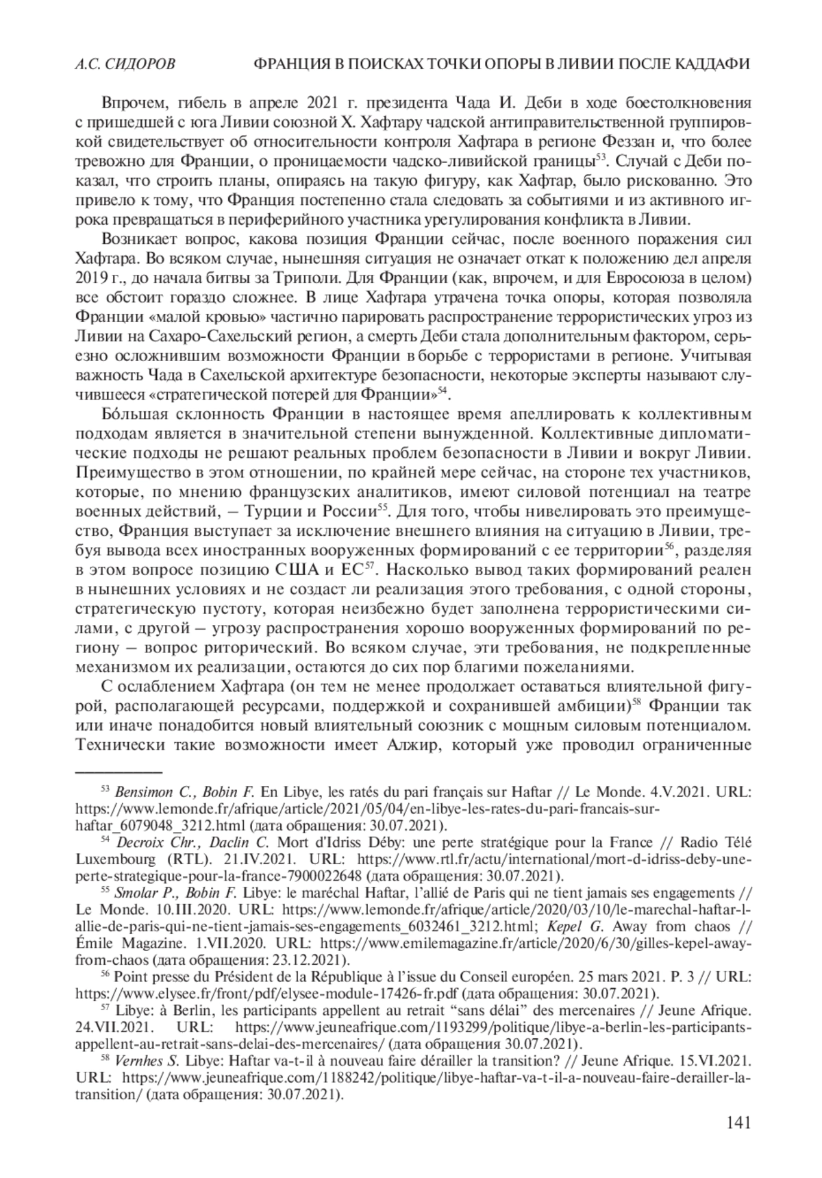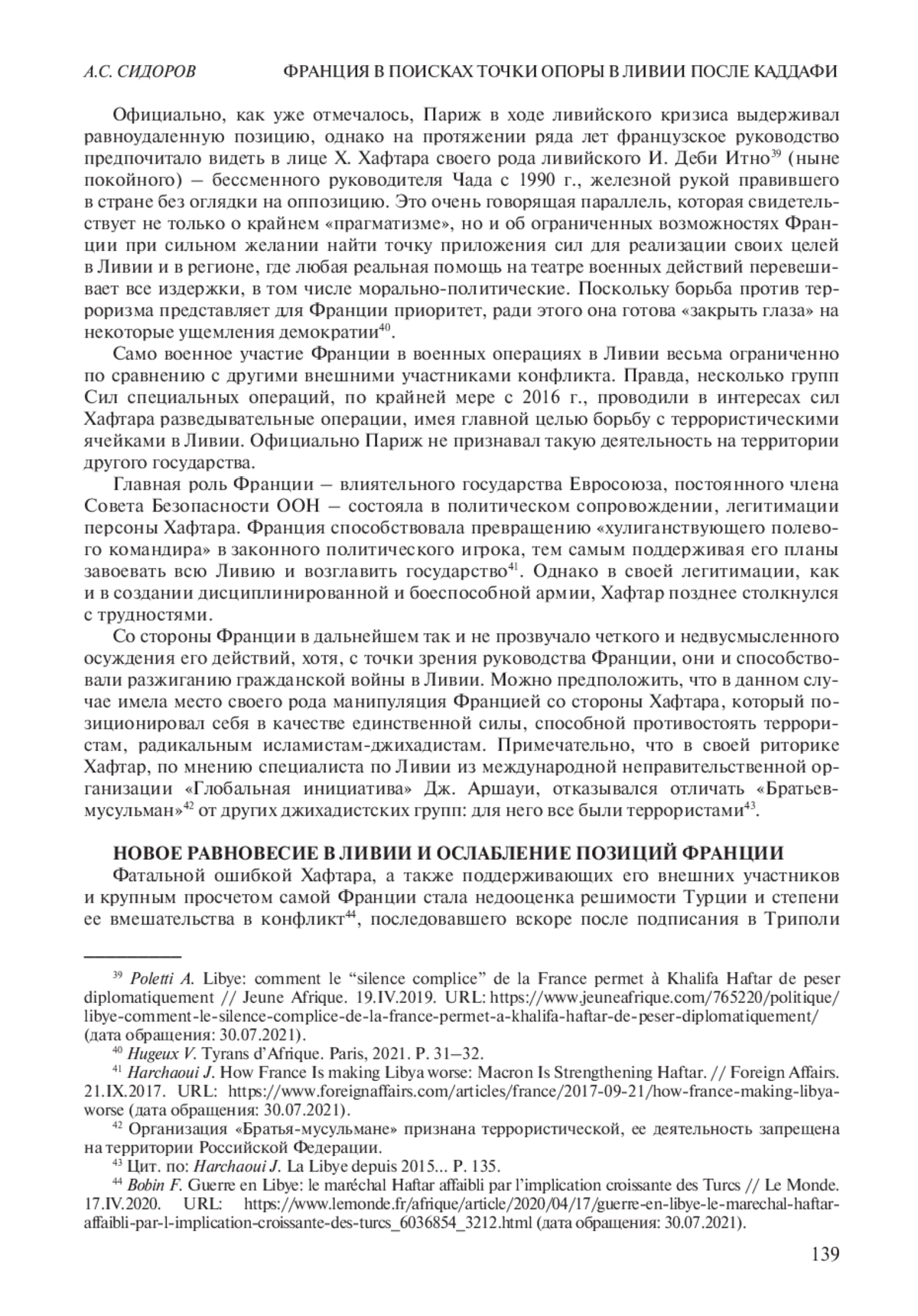 38. Harchaoui J. How France is making Libya worse: Macron is Strengthening Haftar // Foreign Affairs. 21.IX.2017. URL: https://www.foreignaffairs.com/articles/france/2017-09-21/how-france-making-libya-worse (access date: 30.07.2021).