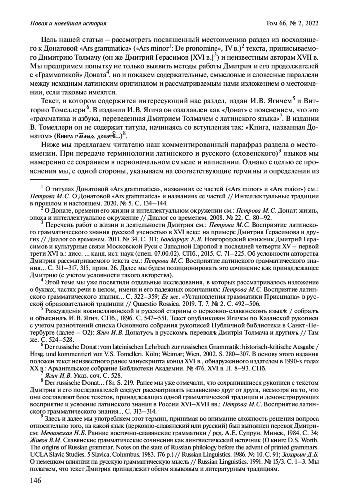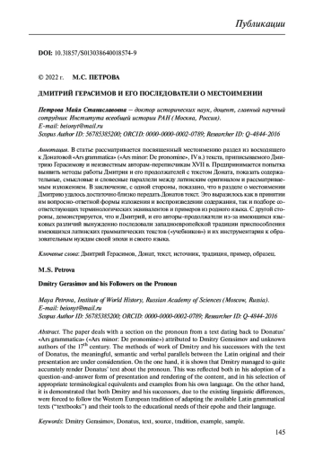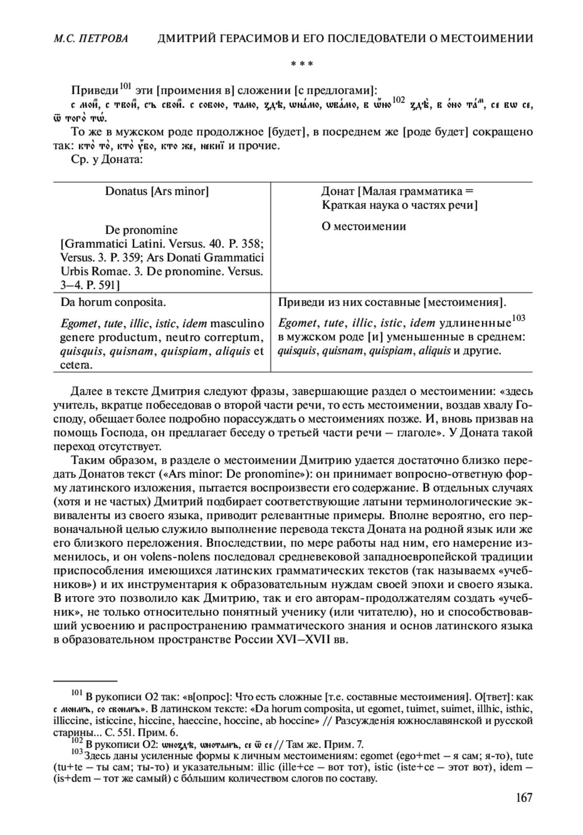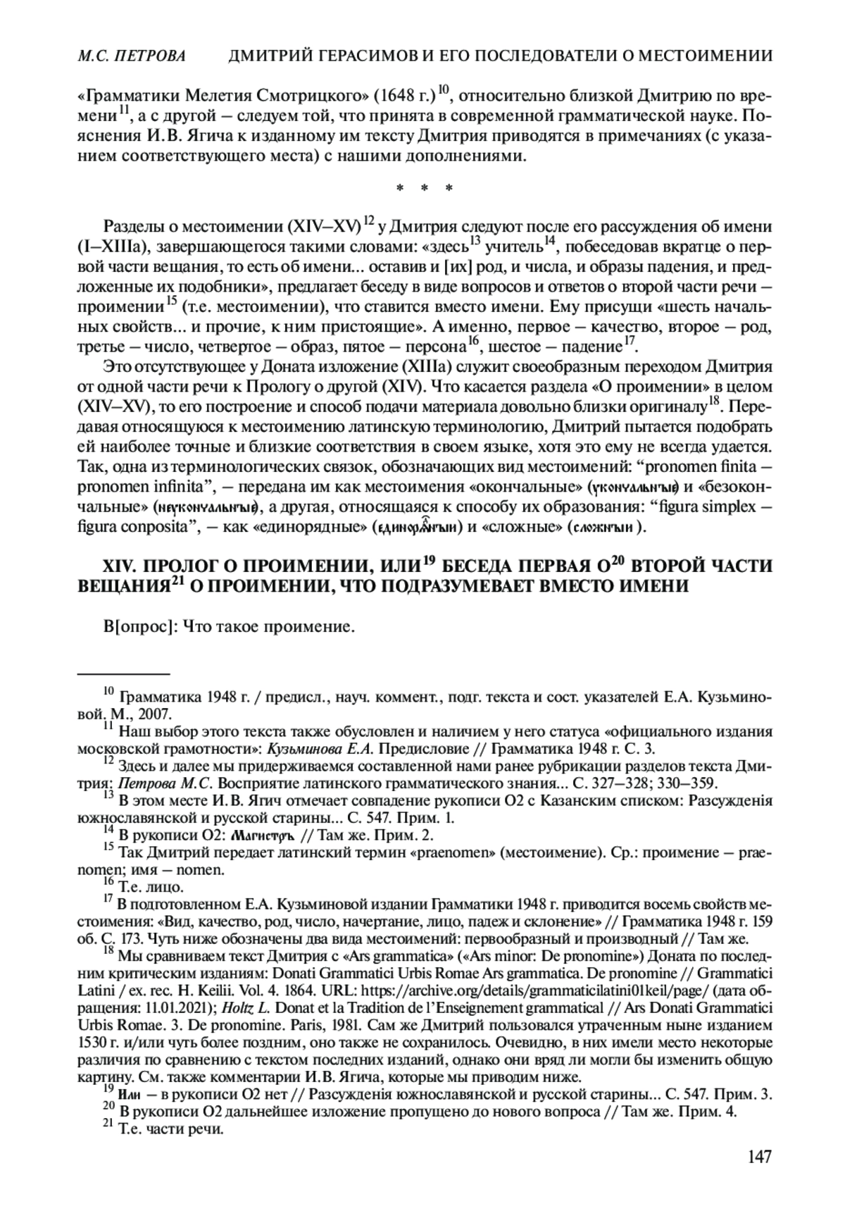 Цель нашей статьи – рассмотреть посвященный местоимению раздел из восходящего к Донатовой «Ars grammatica» («Ars minor1: De pronomine», IV в.)2 текста, приписываемого Димитрию Толмачу (он же Дмитрий Герасимов [XVI в.]3 ) и неизвестным авторам XVII в. Мы предпримем попытку не только выявить методы работы Дмитрия и его продолжателей с «Грамматикой» Доната4, но и покажем содержательные, смысловые и словесные параллели между исходным латинским оригиналом и рассматриваемым нами изложением о местоимении, если таковые имеются