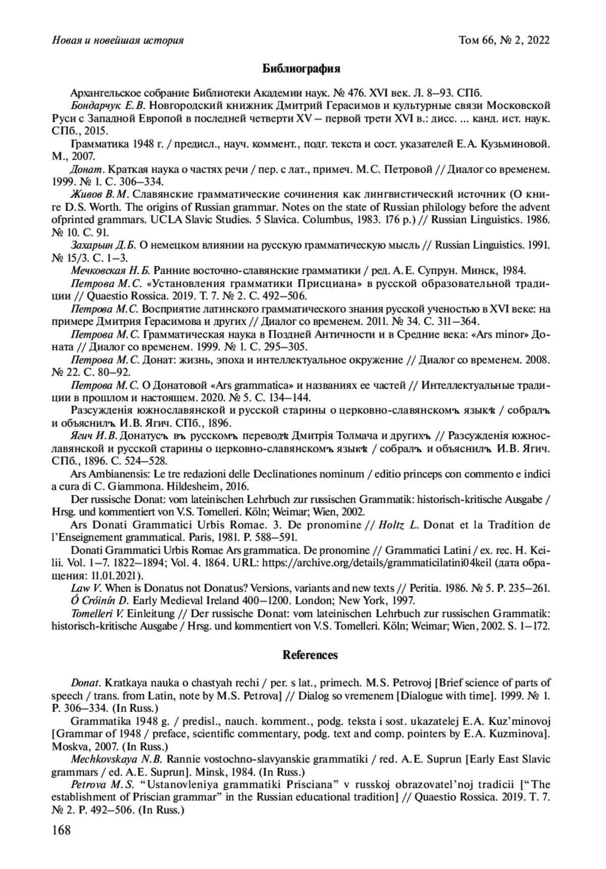 12. Петрова М.С. О Данатовой “Ars grammatical” и названиях ее частей // Интеллектуальные традиции в прошлом и настоящем. 2020. № 5. С. 134-144. EDN: MFSLPK