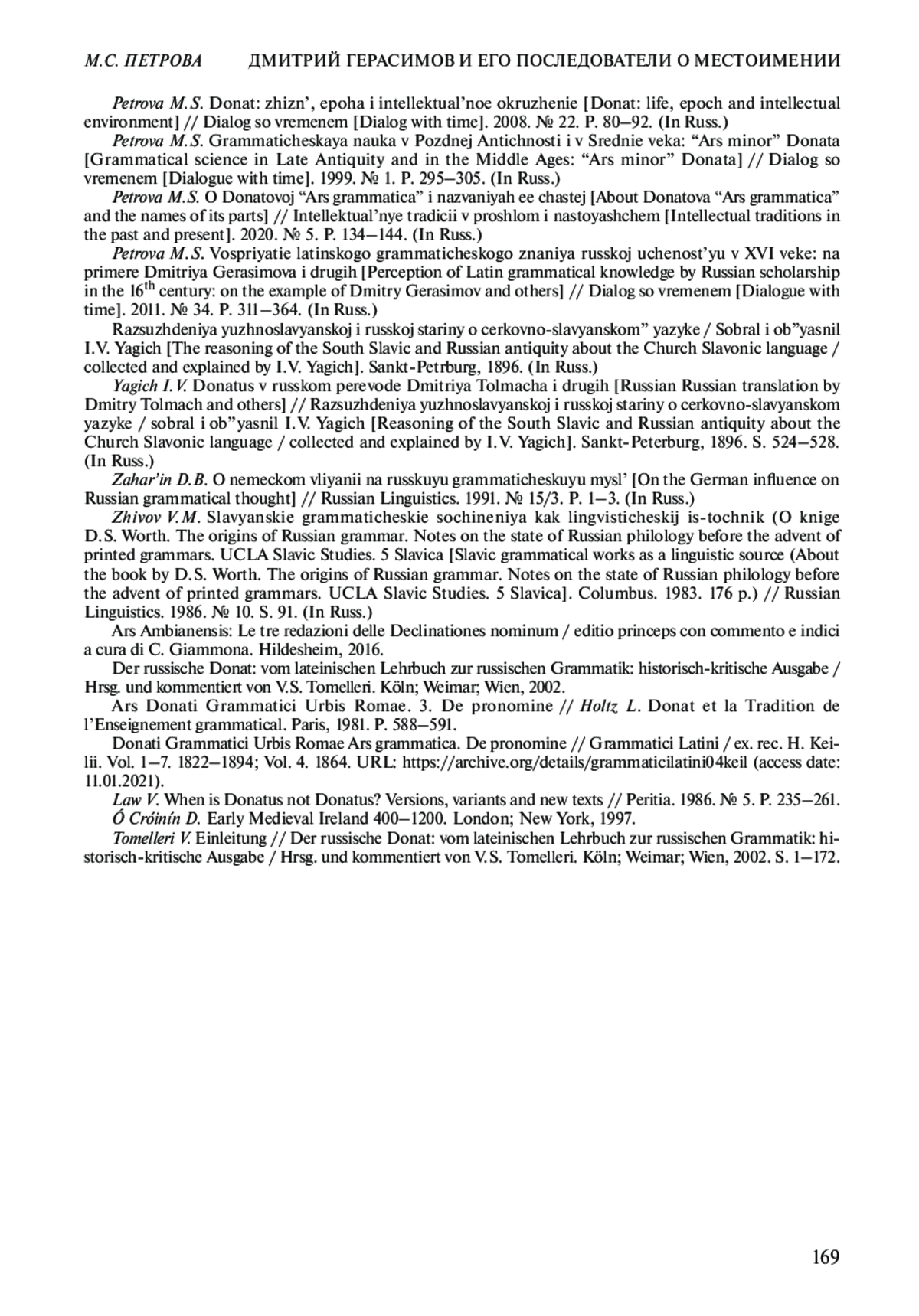 21. Tomelleri V. Einleitung // Der russische Donat: vom lateinischen Lehrbuch zur russischen Grammatik: historisch-kritische Ausgabe / Hrsg. und kommentiert von V.S. Tomelleri. Köln; Weimar; Wien, 2002. S. 1-172.