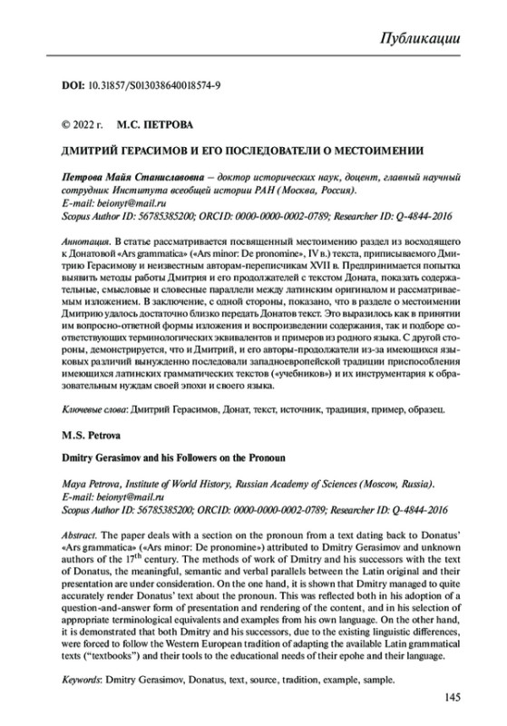 В статье рассматривается посвященный местоимению раздел из восходящего к Донатовой «Ars grammatica» («Ars minor: De pronomine», IV в.) текста, приписываемого Дмитрию Герасимову и неизвестным авторам-переписчикам XVII в. Предпринимается попытка выявить методы работы Дмитрия и его продолжателей с текстом Доната, показать содержательные, смысловые и словесные параллели между латинским оригиналом и рассматриваемым изложением. В заключение, с одной стороны, показано, что в разделе о местоимении Дмитрию удалось достаточно близко передать Донатов текст. Это выразилось как в принятии им вопросно-ответной формы изложения и воспроизведении содержания, так и подборе соответствующих терминологических эквивалентов и примеров из родного языка. С другой стороны, демонстрируется, что и Дмитрий, и его авторы-продолжатели из-за имеющихся языковых различий вынужденно последовали западноевропейской традиции приспособления имеющихся латинских грамматических текстов («учебников») и их инструментария к образовательным нуждам своей эпохи и своего языка