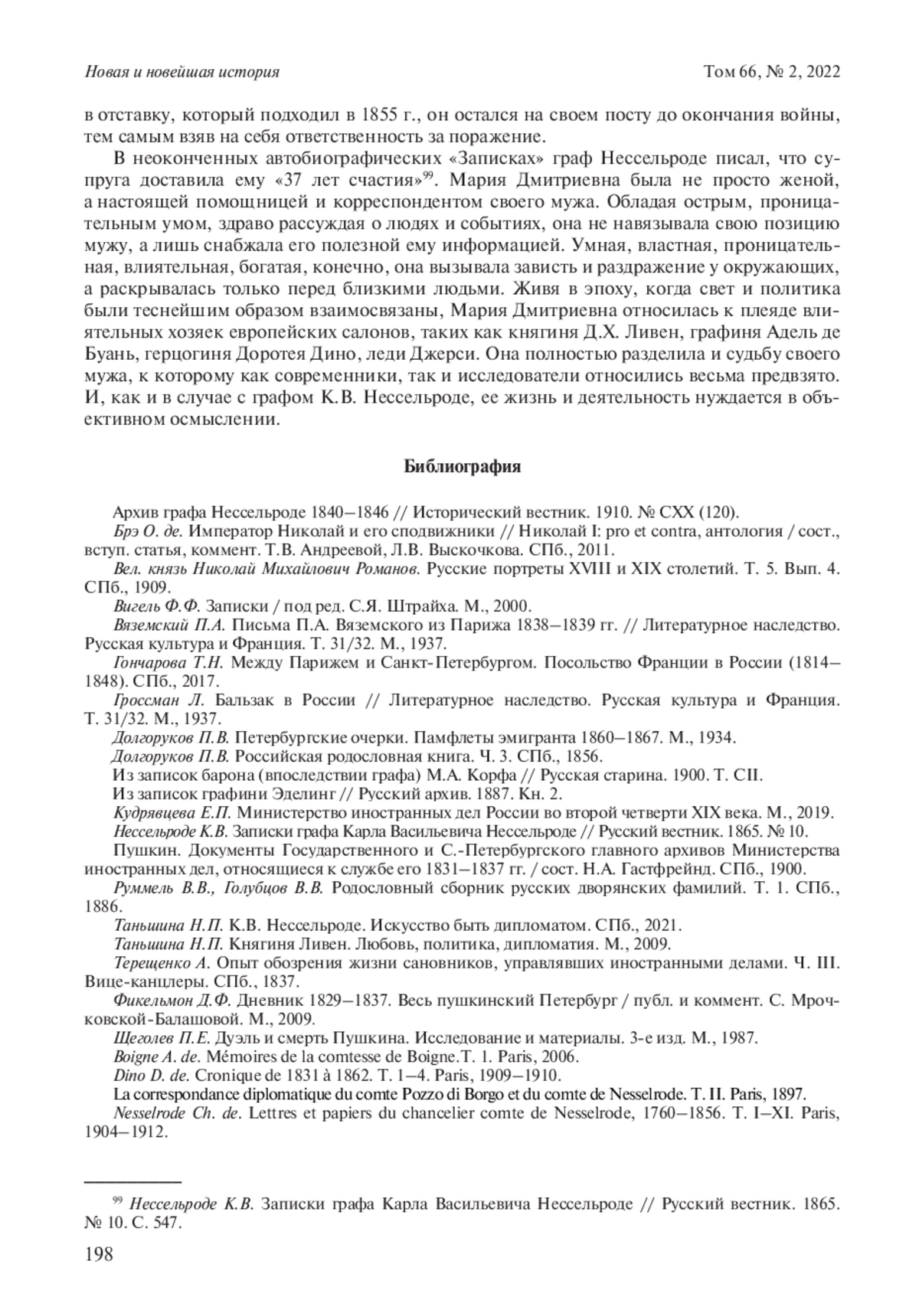 ТАНЬШИНА Н. П. МАРИЯ ДМИТРИЕВНА НЕССЕЛЬРОДЕ: ЖЕНА КАНЦЛЕРА РОССИЙСКОЙ ИМПЕРИИ // НОВАЯ И НОВЕЙШАЯ ИСТОРИЯ. 2022. № 2