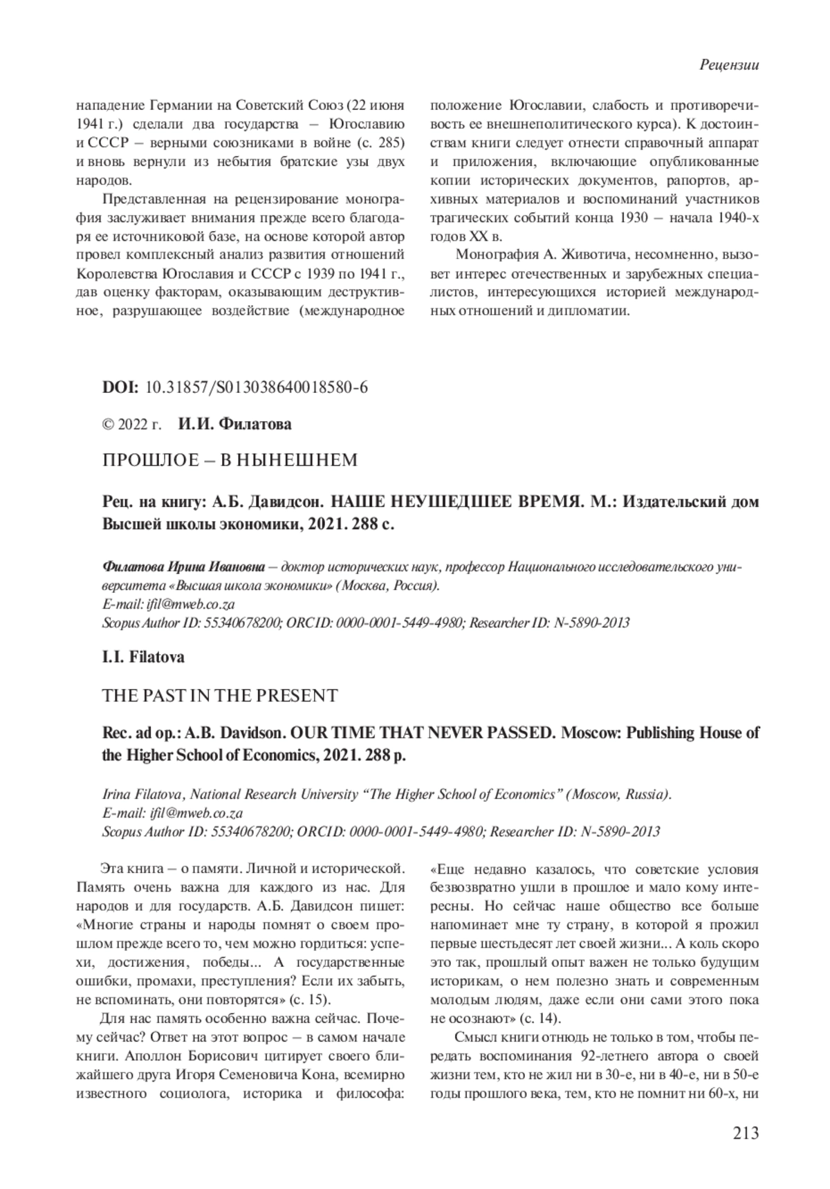 Эта книга – о памяти. Личной и исторической. Память очень важна для каждого из нас. Для народов и для государств. А. Б. Давидсон пишет: «Многие страны и народы помнят о своем прошлом прежде всего то, чем можно гордиться: успехи, достижения, победы… А государственные ошибки, промахи, преступления? Если их забыть, не вспоминать, они повторятся» (с. 15).