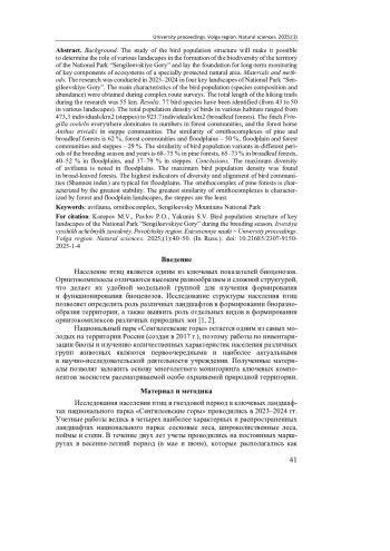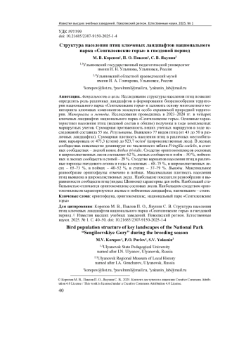 Актуальность и цели. Исследование структуры населения птиц позволит определить роль различных ландшафтов в формировании биоразнообразия территории национального парка «Сенгилеевские горы» и заложить основу многолетнего мониторинга ключевых компонентов экосистем особо охраняемой природной территории. Материалы и методы. Исследования проводились в 2023–2024 гг. в четырех ключевых ландшафтах национального парка «Сенгилеевские горы». Основные характеристики населения птиц (видовой состав и обилие) получены в ходе комплексных маршрутных учетов. Суммарная протяженность пеших учетных маршрутов в ходе исследований составила 55 км. Результаты. Выявлено 77 видов птиц (от 43 до 50 в различных ландшафтах). Суммарная плотность населения птиц в различных местообитаниях варьировала от 473,3 (степи) до 923,7 ос/км² (широколиственные леса). В лесных сообществах повсеместно доминирует по численности зяблик Fringilla coelebs, в степных сообществах – лесной конек Anthus trivialis. Сходство орнитокомплексов сосновых и широколиственных лесов составляет 62 %, лесных сообществ и пойм – 50 %, пойменных и лесных сообществ и степей – 29 %. Сходство вариантов населения птиц в различные периоды гнездового сезона и годы в сосновых – 68–75 %, в широколиственных лесах – 65–73 %, в поймах – 40–52 %, в степях – 37–79 %. Выводы. Максимальное разнообразие орнитофауны отмечено в поймах. Максимальная плотность населения птиц выявлена в широколиственных лесах. Наибольшие показатели разнообразия и выравненности сообществ птиц (индекс Шеннона) характерны для пойм. Наибольшей стабильностью отличается орнитокомплекс сосновых лесов. Наибольшим сходством орнитокомплексов характеризуются лесные и пойменные ландшафты, наименьшим – степи.