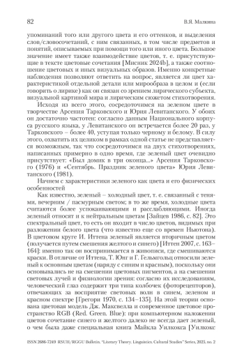 Статья: Зеленый цвет в стихотворениях А. Тарковского и Ю. Левитанского («Был домик в три оконца…» и «Сентябрь. Праздник зеленого цвета») (2025)