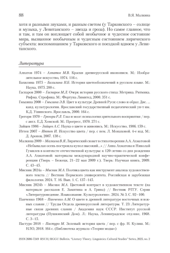 МАЛКИНА В. Я. ЗЕЛЕНЫЙ ЦВЕТ В СТИХОТВОРЕНИЯХ А. ТАРКОВСКОГО И Ю. ЛЕВИТАНСКОГО («БЫЛ ДОМИК В ТРИ ОКОНЦА…» И «СЕНТЯБРЬ. ПРАЗДНИК ЗЕЛЕНОГО ЦВЕТА») // ВЕСТНИК РГГУ. СЕРИЯ «ЛИТЕРАТУРОВЕДЕНИЕ. ЯЗЫКОЗНАНИЕ. КУЛЬТУРОЛОГИЯ». 2025. № 2