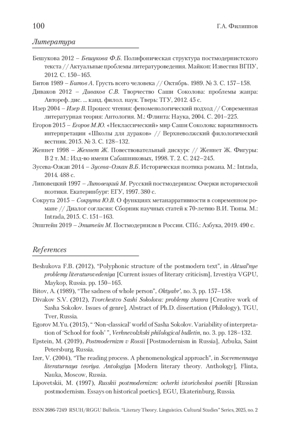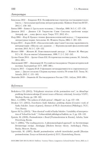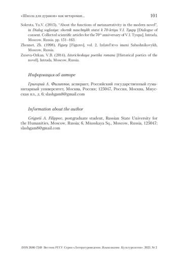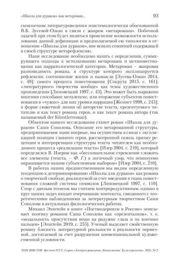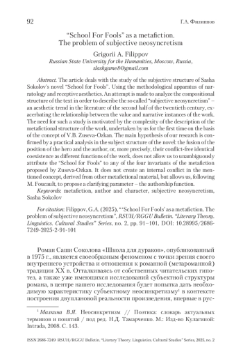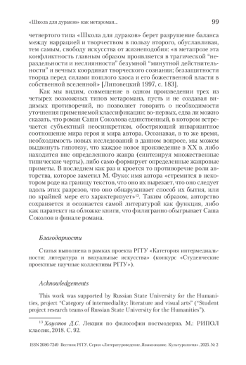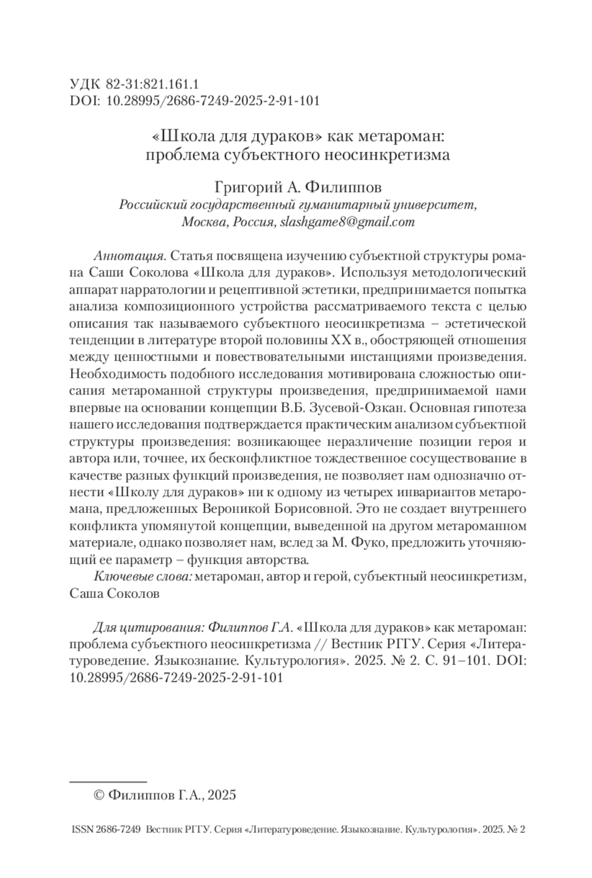 ФИЛИППОВ Г. А. «ШКОЛА ДЛЯ ДУРАКОВ» КАК МЕТАРОМАН: ПРОБЛЕМА СУБЪЕКТНОГО НЕОСИНКРЕТИЗМА // ВЕСТНИК РГГУ. СЕРИЯ «ЛИТЕРАТУРОВЕДЕНИЕ. ЯЗЫКОЗНАНИЕ. КУЛЬТУРОЛОГИЯ». 2025. № 2