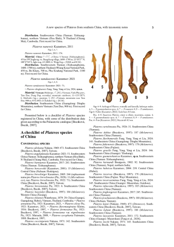 Новый вид рода Plateros Bourgeois, 1879, P. guomenshanicus Kazantsev sp. n., описывается из южного Юннаня, Китай. Ещё три вида, P. anguliplanatus Kazantsev, 2021, P. nanensis Kazantsev, 2011 и P. tamdaoensis Kazantsev, 2021, ранее известные лишь из Индокитая, впервые указываются для Китая. Plateros dinghuensis Fang, Yang, Yang et Liu, 2024, syn. n. сводится в синоним к Plateros tamdaoensis Kazantsev, 2021. Число видов рода в Китае увеличивается до 57. Предлагается замещающее название Plateros yangorum nom. n. pro Plateros nigripennis Fang, Yang, Yang et Liu, 2024, из юго-восточного Китая (Гуанси), nec Plateros nigripennis Kazantsev, 2011, из Коста-Рики. Приводится полный список видов Plateros Китая.