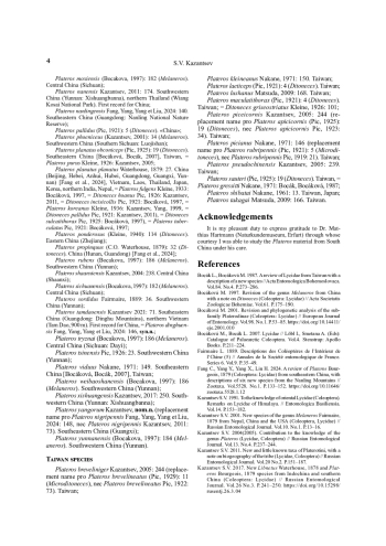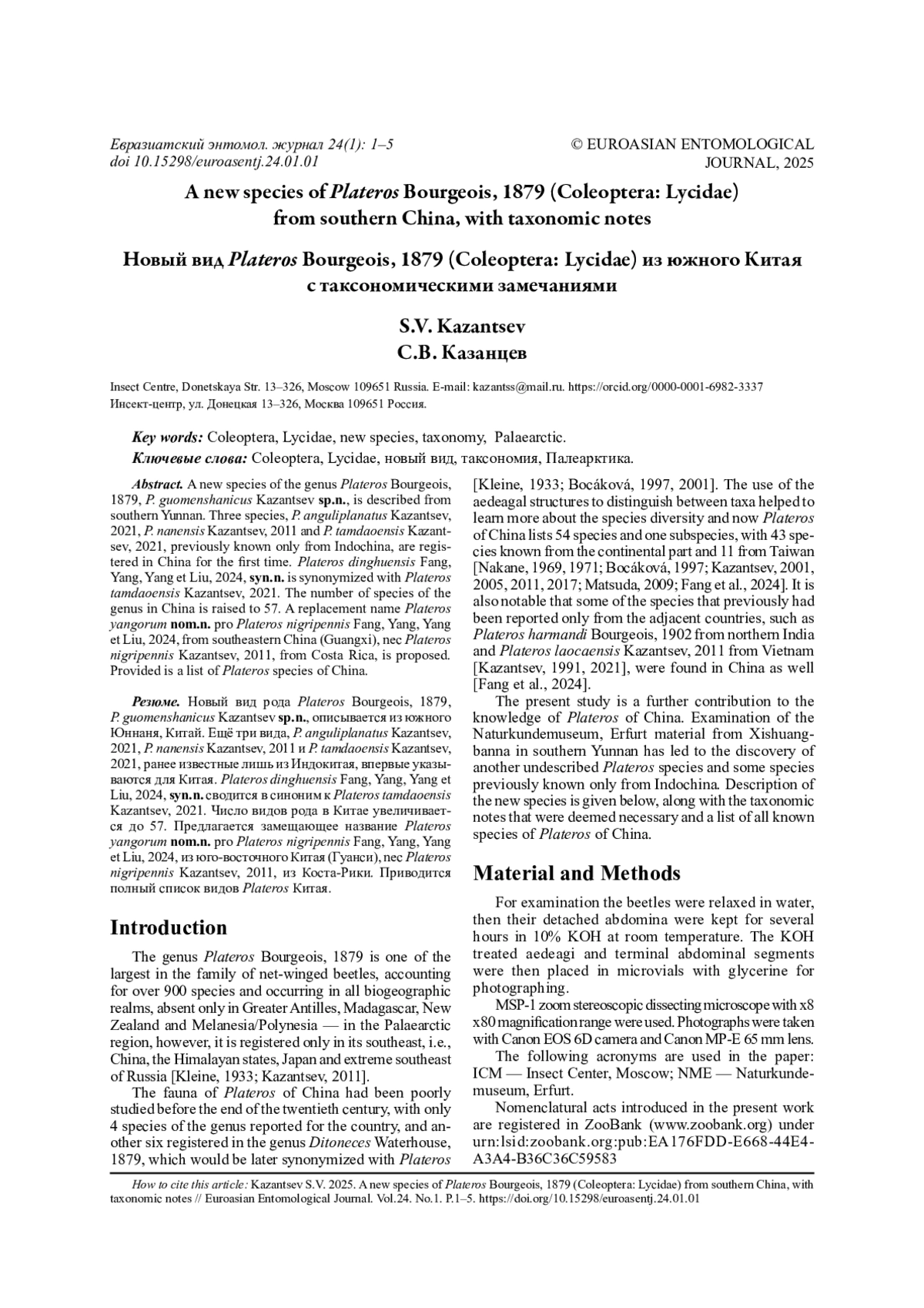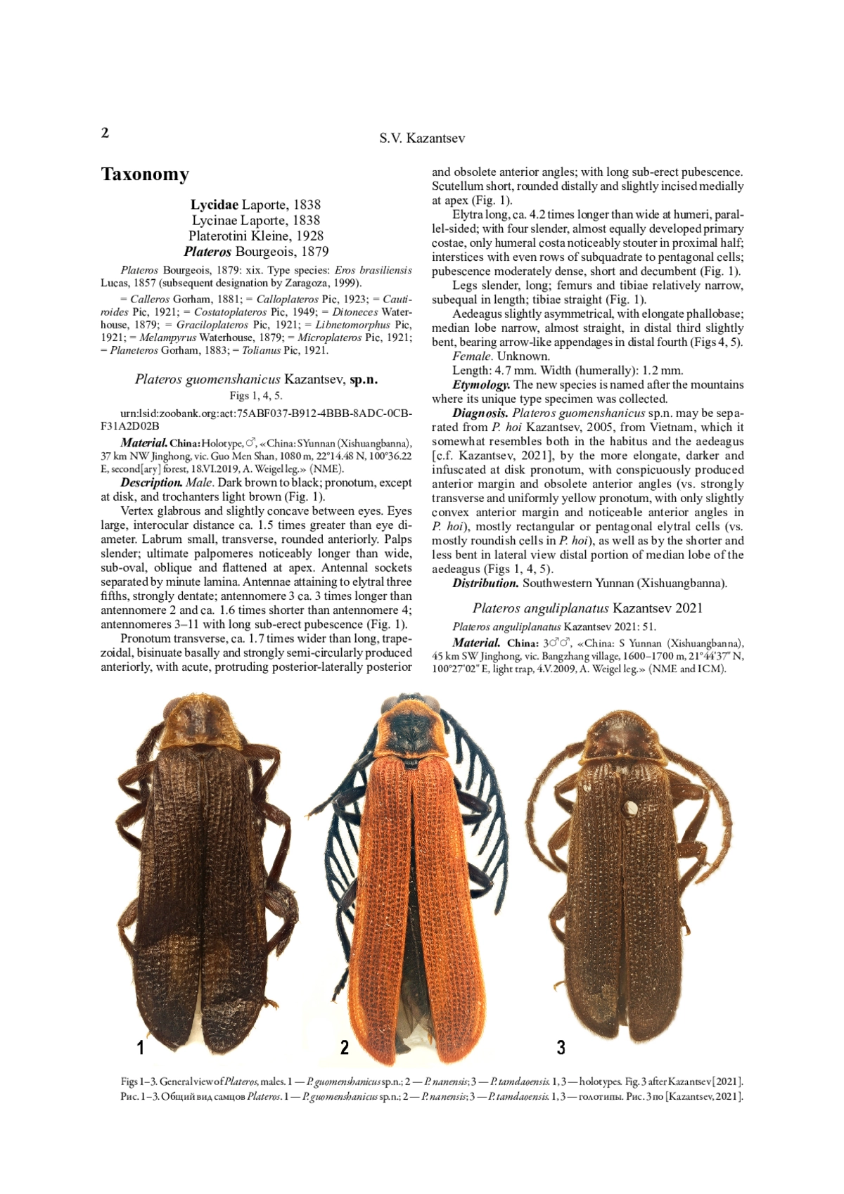 12. Kazantsev S.V. 2021. A review of Plateros Bourgeois, 1879 of Indochina (Coleoptera: Lycidae) // Russian Entomological Journal. Vol.30. No.1. P.47-73. DOI: 10.15298/rusentj.30.1.07
