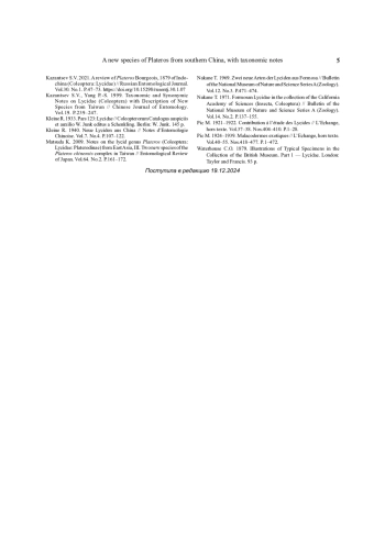 6. Fang C., Yang Y., Yang X., Liu H. 2024. A review of Plateros Bourgeois, 1879 (Coleoptera: Lycidae) from southeastern China, with descriptions of six new species from the Nanling Mountains // Zootaxa. Vol.5528. No.1. P.133-152. DOI: 10.11646/zootaxa.5528.1.12