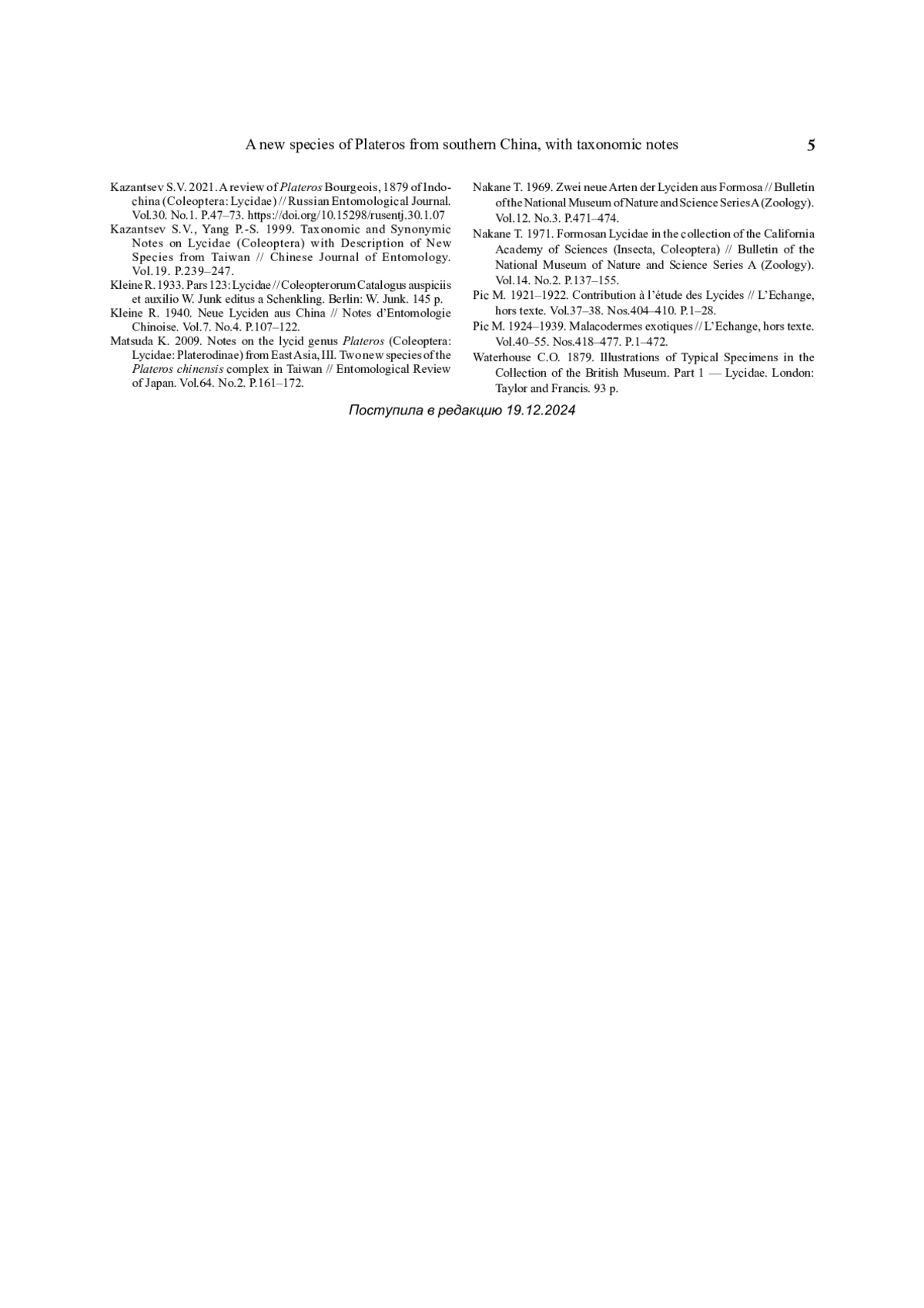 12. Казанцев С. В. 2021. Обзор Plateros Bourgeois, 1879 из Индокитая (Coleoptera: Lycidae) // Российский энтомологический журнал. Том 30. № 1. С. 47–73. DOI: 10.15298/rusentj.30.1.07