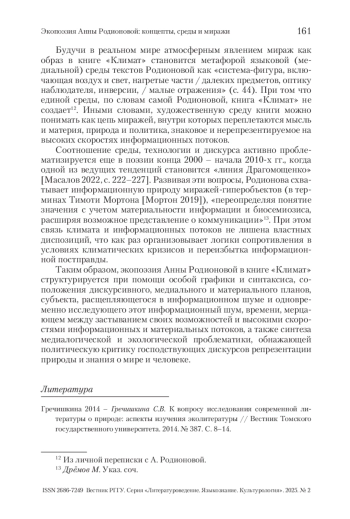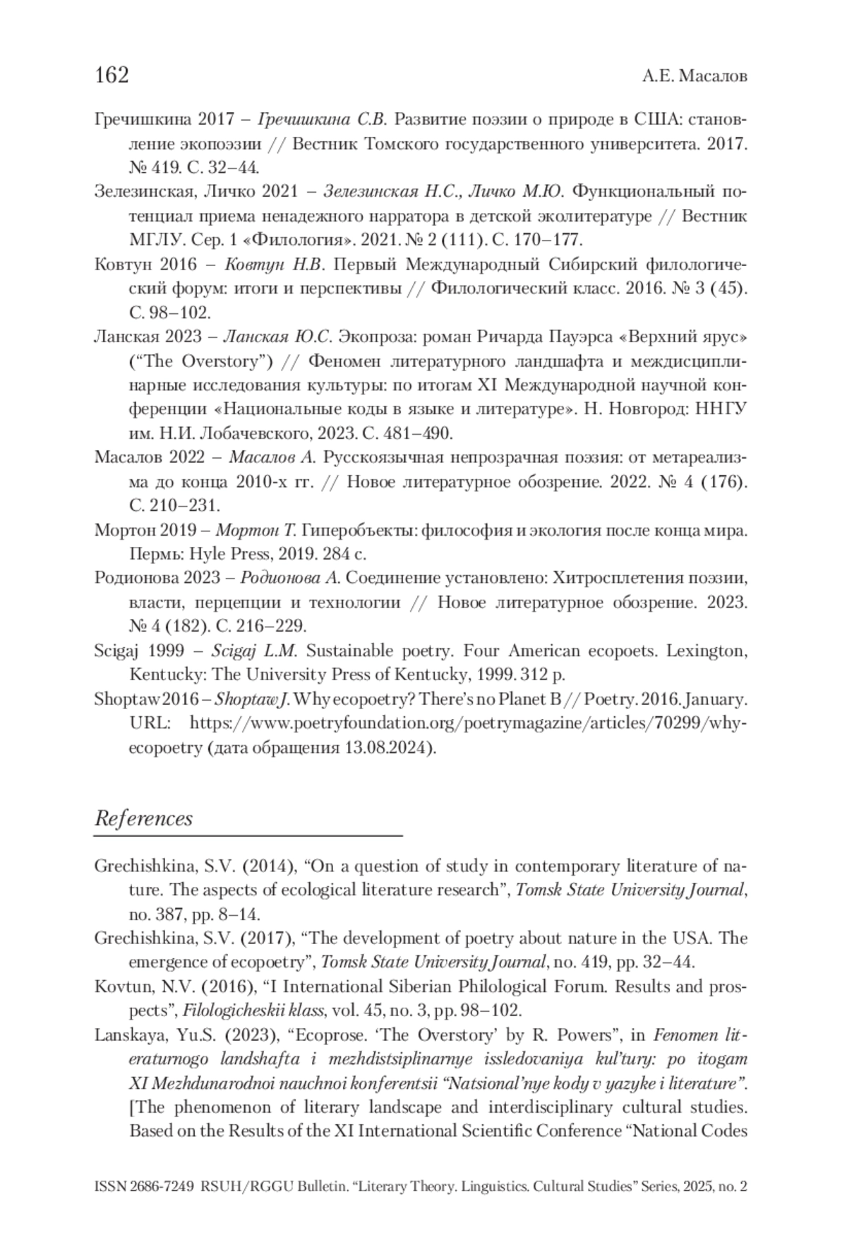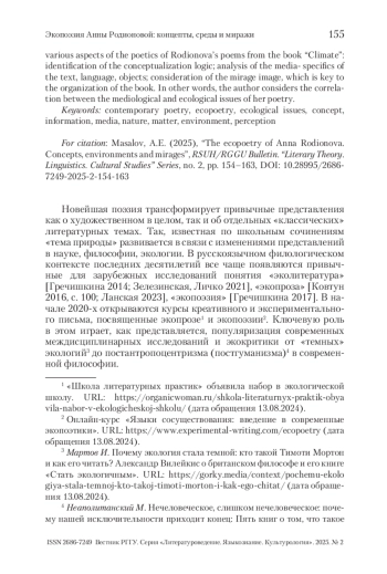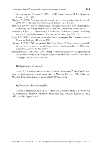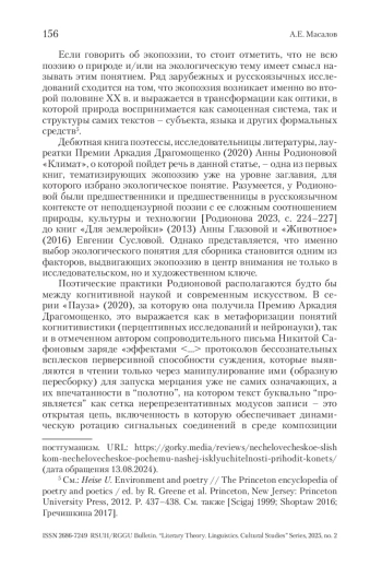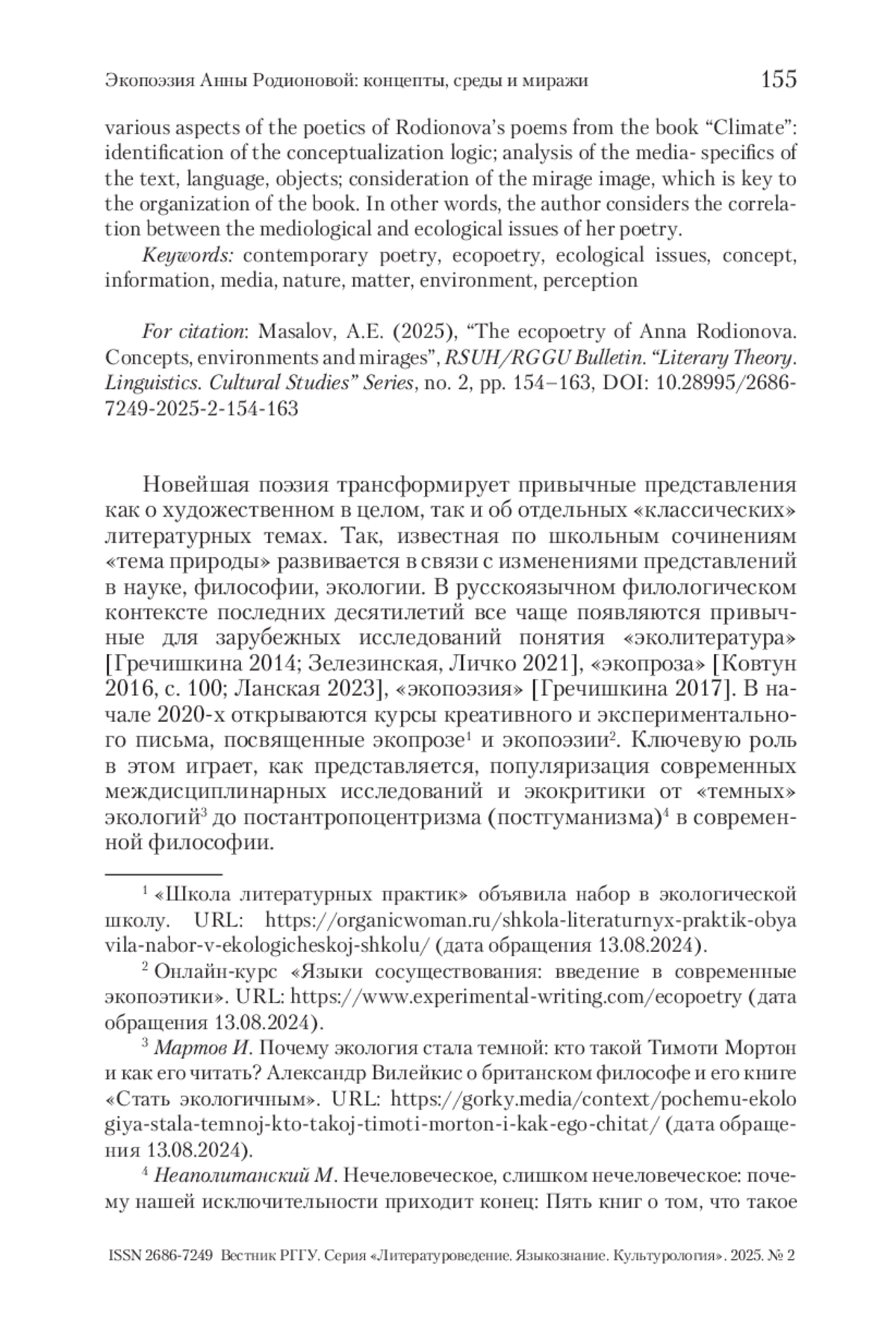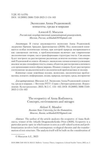 МАСАЛОВ А. Е. ЭКОПОЭЗИЯ АННЫ РОДИОНОВОЙ: КОНЦЕПТЫ, СРЕДЫ И МИРАЖИ // ВЕСТНИК РГГУ. СЕРИЯ «ЛИТЕРАТУРОВЕДЕНИЕ. ЯЗЫКОЗНАНИЕ. КУЛЬТУРОЛОГИЯ». 2025. № 2