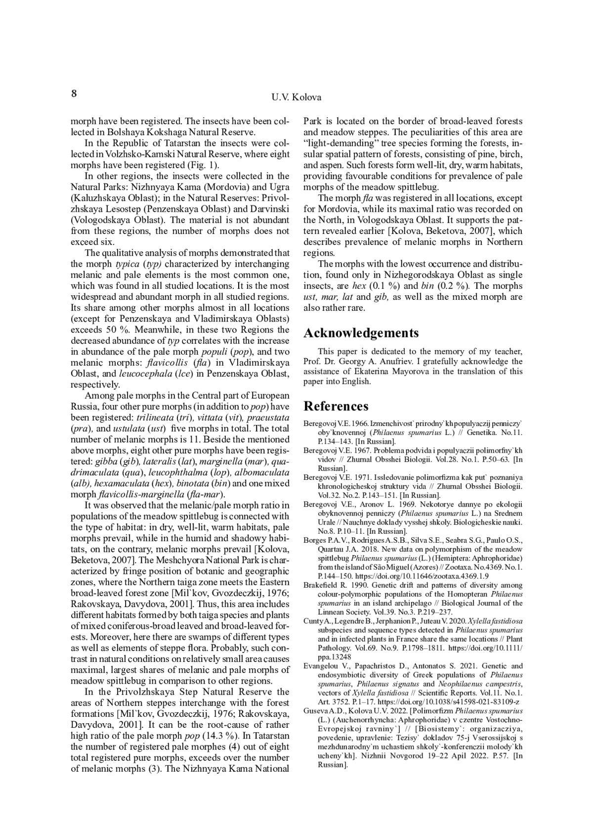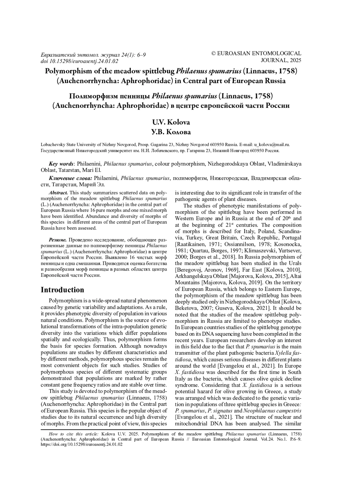 9. Guseva A.D., Kolova U.V. 2022. [Polimorfizm Philaenus spumarius (L.) (Auchenorrhyncha: Aphrophoridae) v czentre Vostochno-Evropejskoj ravniny’] // [Biosistemy’: organizacziya, povedenie, upravlenie: Tezisy’ dokladov 75-j Vserossijskoj s mezhdunarodny’m uchastiem shkoly’-konferenczii molody’kh ucheny’kh]. Nizhnii Novgorod 19-22 Apil 2022. P.57. [In Russian].