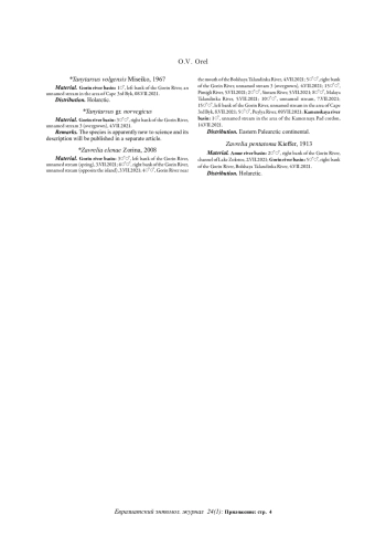5. Yavorskaya N.M., Bobrovsky V.V. 2023. Taxonomic composition of benthic invertebrates of the Komsomolskii Nature Reserve watercourses (Khabarovsky Region) // Amurian Zoological Journal. Vol.XV. No.3. P.657-678. [In Russian]. https://www.