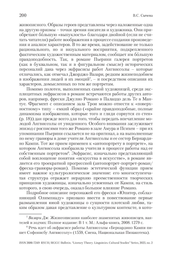 В статье анализируется использование экфрасиса как ключевого литературного приема в биографической прозе на примере романа Джованны Пьерини «Дама с веером», посвященном жизни художницы Софонисбы Ангвиссолы. Опираясь на классификации, предложенные Е. В. Яценко, автор прибегает к типологизации экфрасисов «по объему»: полный, представляющий собой подробные описания произведений, зачастую с акцентом на технические и стилистические детали, и свернутый, где произведения искусства упоминаются вскользь и служат средством развития сюжета и передачи культурного контекста эпохи. Отдельное внимание уделяется косвенному экфрасису, относящемуся к типологии «по объекту описания» и соответствующему классическому определению тропа, через который передаются детали живописных техник и эмоциональное восприятие картин. Исследование демонстрирует, как биографическая проза о художниках позволяет расширить дискуссию о парагоне искусств благодаря взаимосвязи между визуальными и вербальными видами искусства, что иллюстрируется через примеры экфрасисов работ художницы Софонисбы Ангвиссолы, а также через анализ техник, приемов и различных типов восприятия, к которым прибегает Пьерини для воссоздания художественных образов через описания процесса создания произведений. Таким образом, доказывается релевантность использования экфрасиса в прозаическом произведении не только с эстетической точки зрения, но и для развития повествования в искусствоведческом ключе.