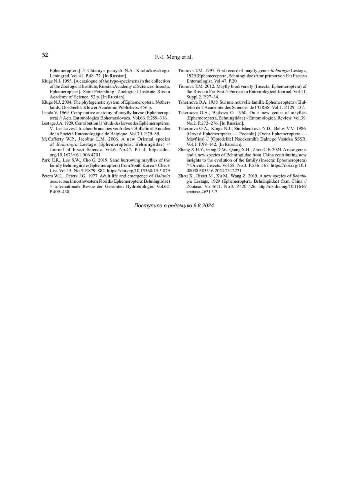 17. Zheng X.H.Y., Gong D.W., Qiang X.H., Zhou C.F. 2024. A new genus and a new species of Behningiidae from China contributing new insights to the evolution of the family (Insecta: Ephemeroptera) // Oriental Insects. Vol.58. No.3. P.536-567. DOI: 10.1080/00305316.2024.2312271