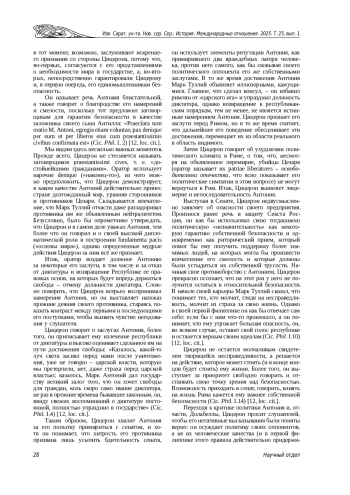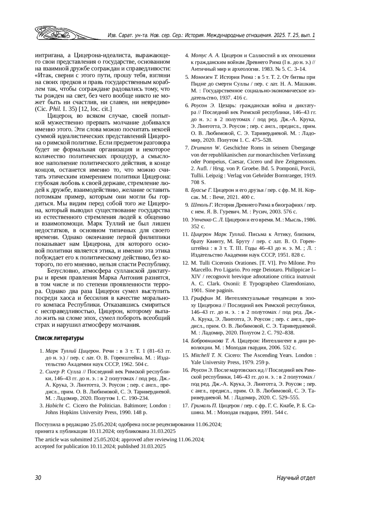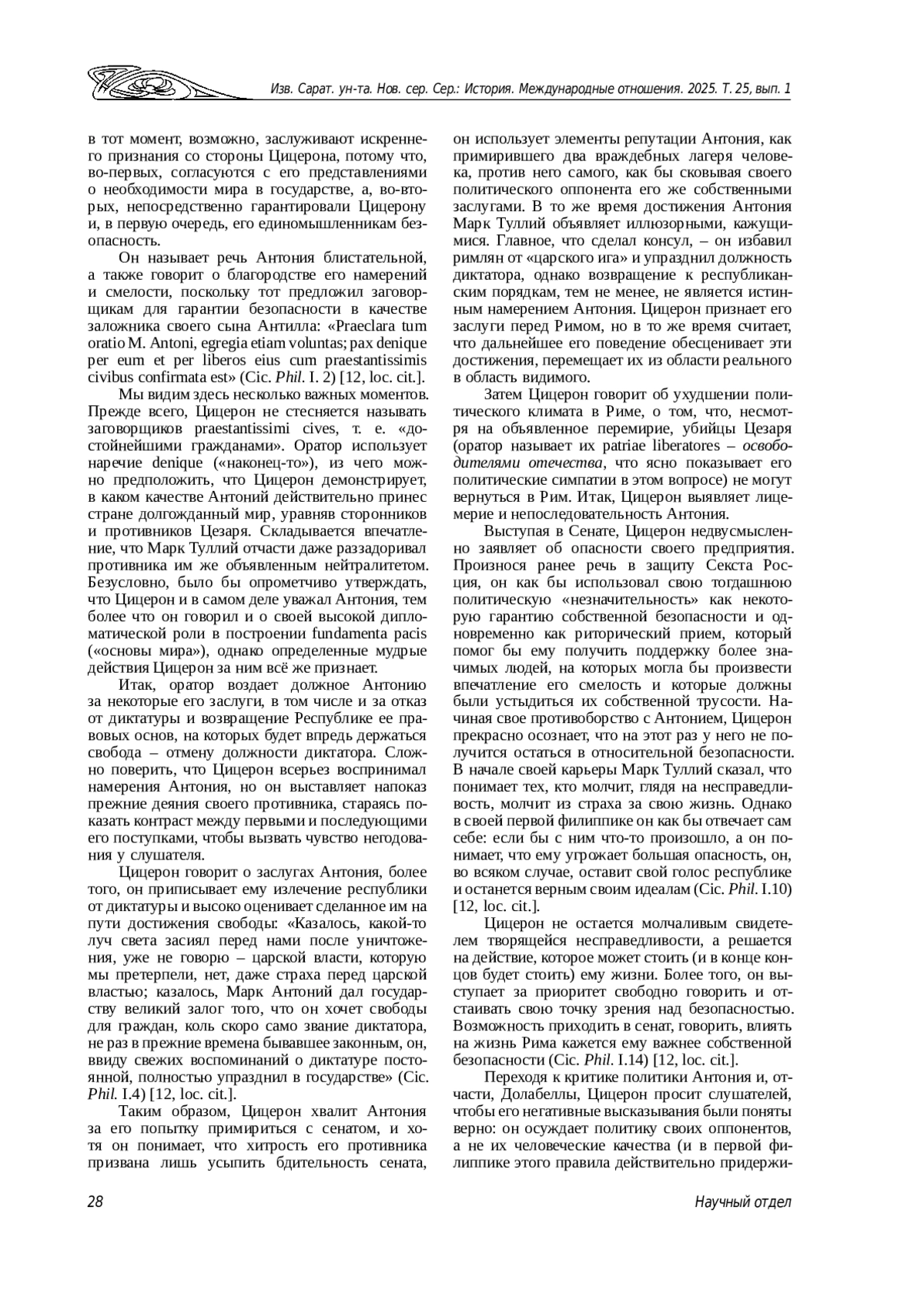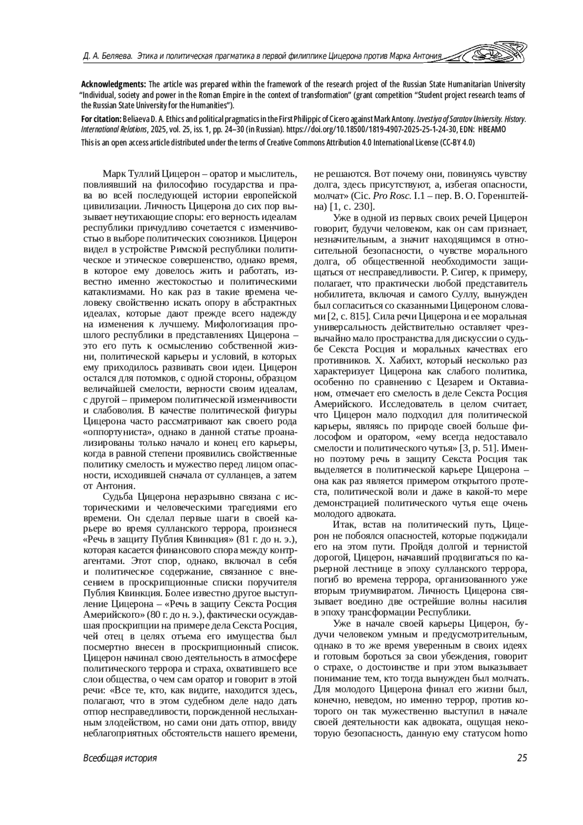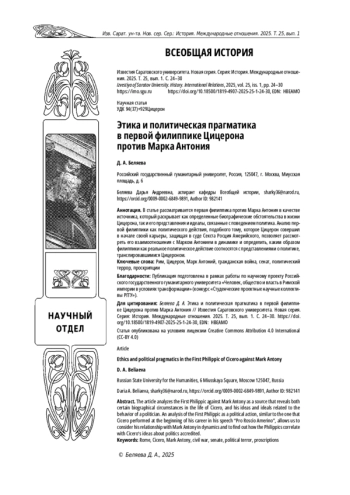 БЕЛЯЕВА Д. ЭТИКА И ПОЛИТИЧЕСКАЯ ПРАГМАТИКА В ПЕРВОЙ ФИЛИППИКЕ ЦИЦЕРОНА ПРОТИВ МАРКА АНТОНИЯ // ИЗВЕСТИЯ САРАТОВСКОГО УНИВЕРСИТЕТА. НОВАЯ СЕРИЯ. СЕРИЯ: ИСТОРИЯ. МЕЖДУНАРОДНЫЕ ОТНОШЕНИЯ. 2025. Т. 25 № 1