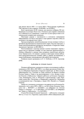 Представлены данные о распространении и биологии размножения гаги обыкновенной на севере архипелага Новая Земля, полученные в результате визуальных наблюдений в 2012–2022 годах и с помощью фотоловушек в 2020–2023 годах. Большинство гаг гнездятся колониями на небольших островах вдоль побережья с плотностью от 0,6 до 50 гнёзд/га; на побережье Северного острова было обнаружено лишь несколько гнёзд (от 0,01 до 0,1 гнёзд/га). Гагары прилетают в регион в конце мая. Инкубационный период длится с начала июня до середины августа из-за того, что самки, потерявшие первую кладку, откладывают яйца повторно. Большинство самцов покидают колонии к концу июня. Сроки отлёта гагар из региона неизвестны; некоторые из них встречаются там даже в середине октября. На кладки охотятся большой поморник ( Stercorarius skua ), сизая чайка ( Larus hyperboreus ), большая чёрная чайка ( L. marinus ) и белый медведь ( Ursus maritimus ). Хищничество песца ( Alopex lagopus ) незначительно, поскольку в период гнездования морские острова с колониями гаг для них недоступны. На успешность гнездования также влияет деятельность человека (туризм и визиты сотрудников национального парка «Русская Арктика»), которая приводит к беспокойству насиживающих птиц и способствует распространению хищников. Для оценки численности и динамики обыкновенной гаги в регионе в целом необходимо обследовать другие потенциальные места гнездования и вести постоянный мониторинг в регионе. Следует ограничить деятельность человека в местах гнездования.