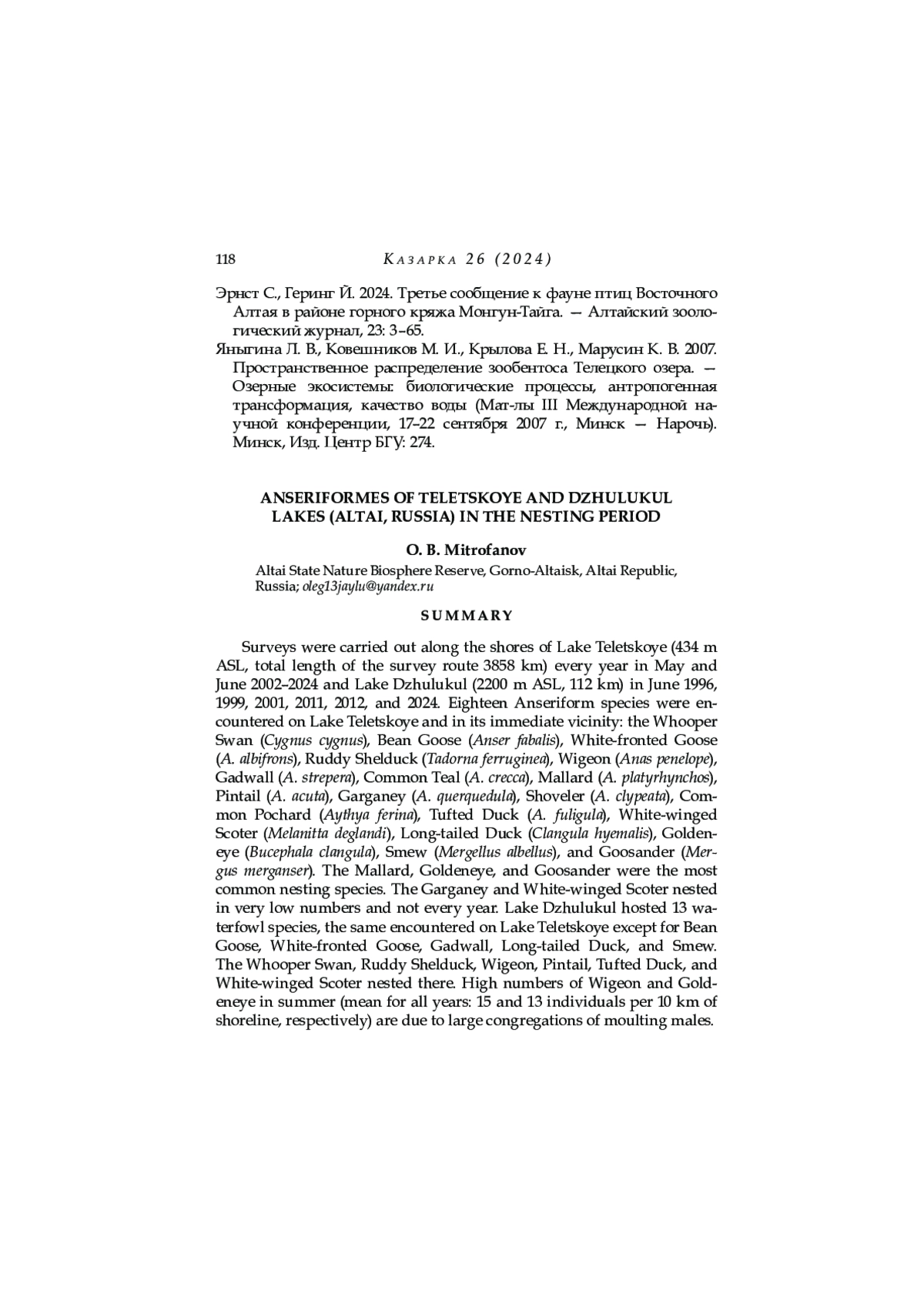 25. Митрофанов О. Б. 2020. Новые данные о миграции крупных представителей отряда Гусеобразные на Телецком озере. - Труды Тигирекского заповедника. Вып. 12. Барнаул: 82-86.