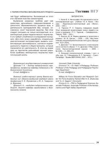 ДРОНОВ А. А., ДРОНОВА Т. А. ЭСКИЗ ИМПЛИЦИТНОГО ТВОРЧЕСТВА ПЕДАГОГА ВЫСШЕЙ ШКОЛЫ // ВЕСТНИК ВОРОНЕЖСКОГО ГОСУДАРСТВЕННОГО УНИВЕРСИТЕТА. СЕРИЯ: ПРОБЛЕМЫ ВЫСШЕГО ОБРАЗОВАНИЯ. 2024. № 2