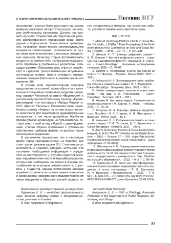 КУРГАНОВА Е. Б. ПЕДАГОГИКА ПРОТИВОДЕЙСТВИЯ ФЕЙКАМ В СОЦИАЛЬНЫХ МЕДИА В СИТУАЦИИ ПОСТПРАВДЫ // ВЕСТНИК ВОРОНЕЖСКОГО ГОСУДАРСТВЕННОГО УНИВЕРСИТЕТА. СЕРИЯ: ПРОБЛЕМЫ ВЫСШЕГО ОБРАЗОВАНИЯ. 2024. № 2