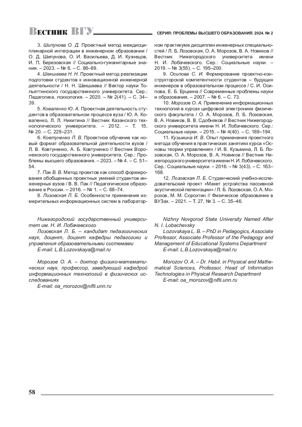 8. Лозовская Л. Б. Особенности применения измерительных информационных систем в лабораторном практикуме дисциплин инженерных специальностей / Л. Б. Лозовская, О. А. Морозов, В. А. Новиков // Вестник Нижегородского университета имени Н. И. Лобачевского. Сер.: Социальные науки. -2019. - № 3(55). - С. 195-200. EDN: QASZDX