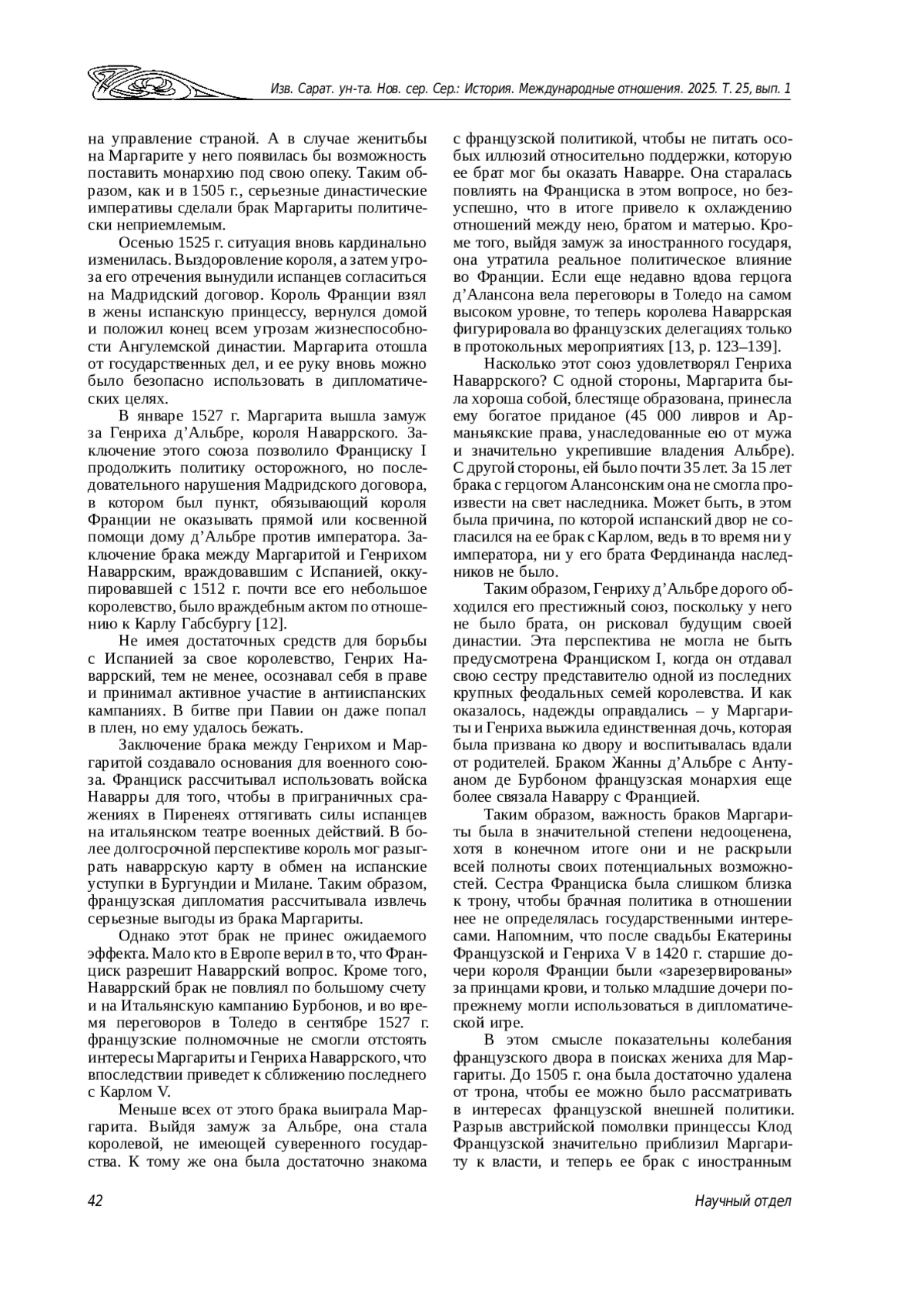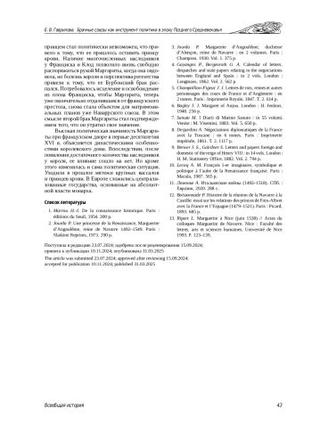 Статья посвящена брачной политике французского королевского дома в первой четверти XVI в. Автор выявляет причины заключения династических браков, мотивы выбора брачной стратегии. В центре внимания статьи – судьба сестры французского короля Франциска I Маргариты Ангулемской, которая играла заметную роль не только в истории Франции, но и оказала влияние на политическую ситуацию в Европе, создавая перспективы брачных комбинаций, определявших политику ведущих европейских государств этой эпохи.