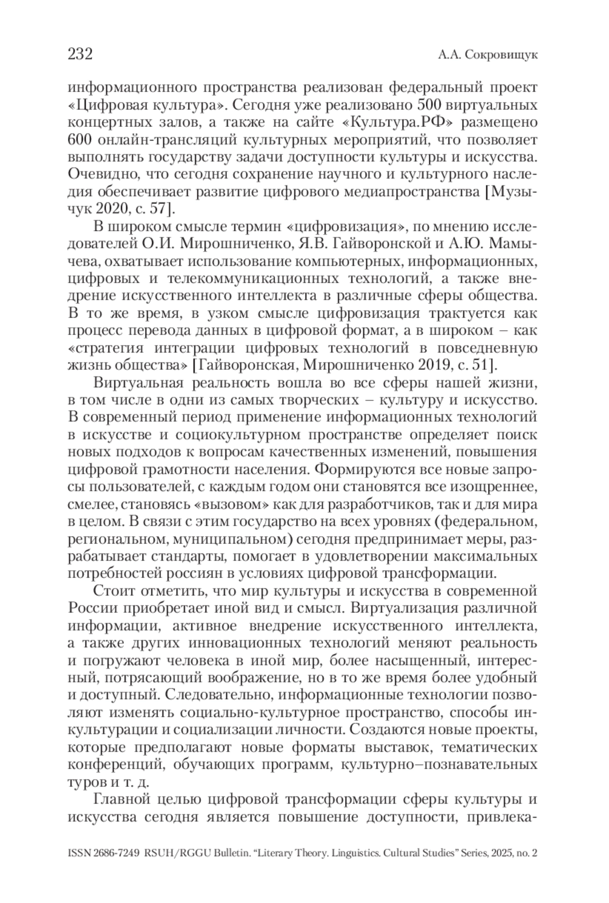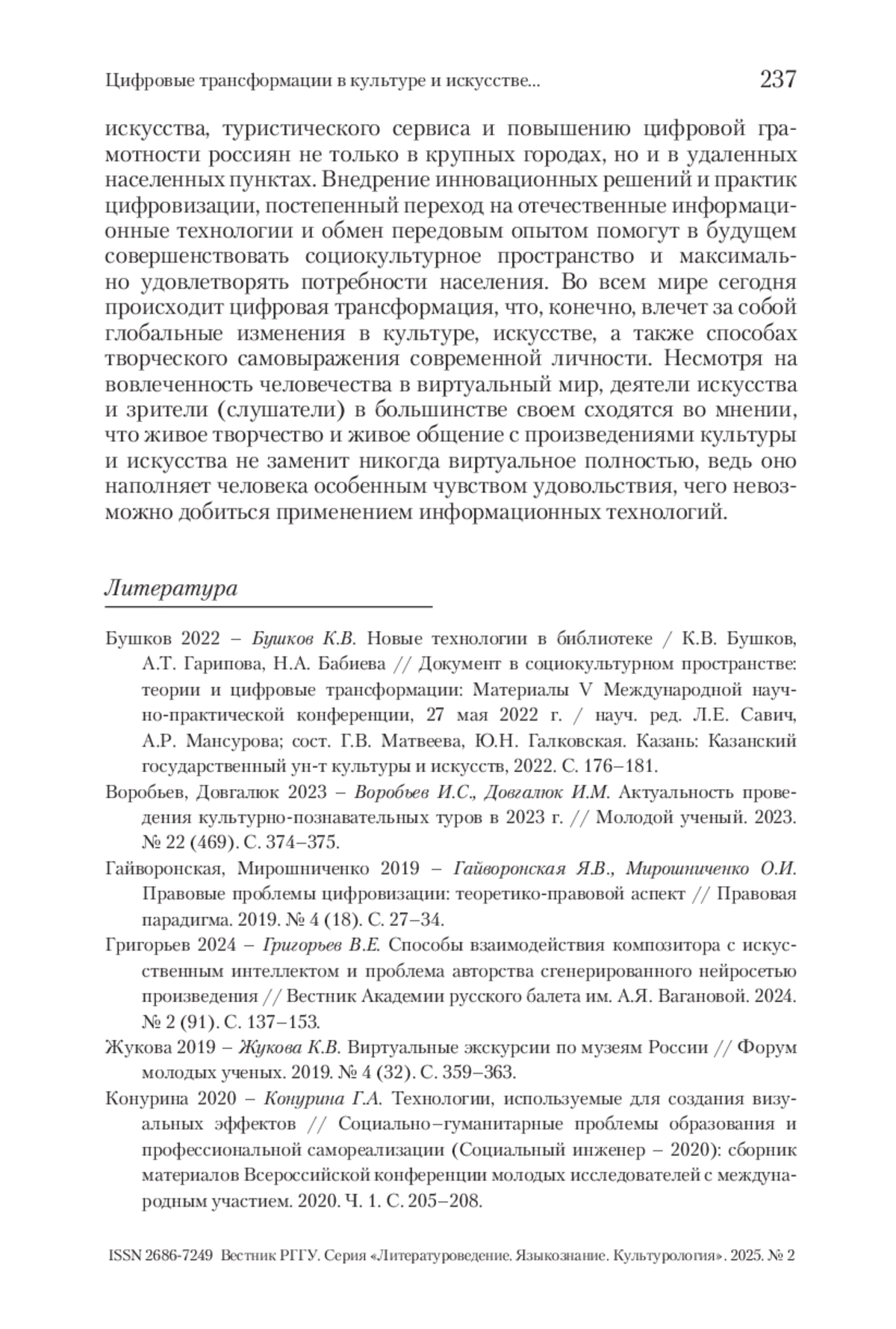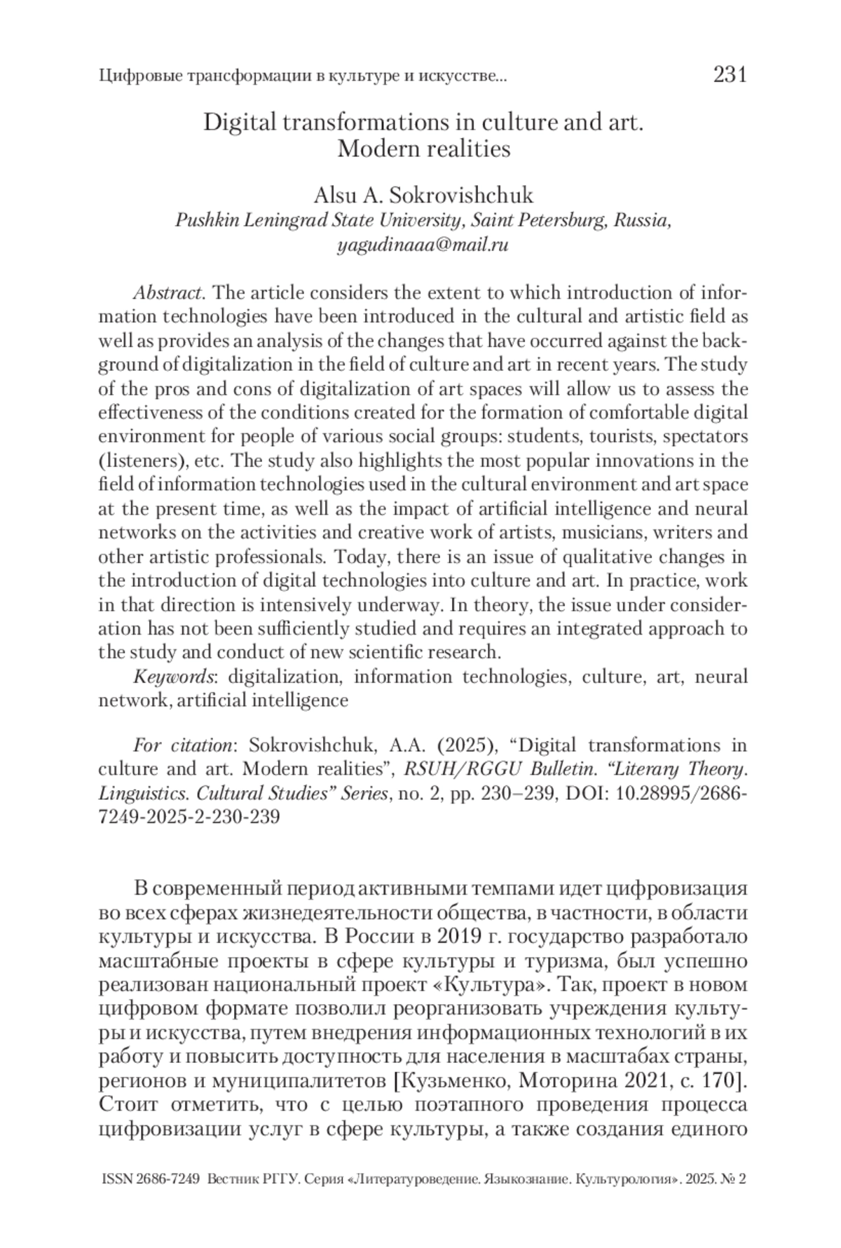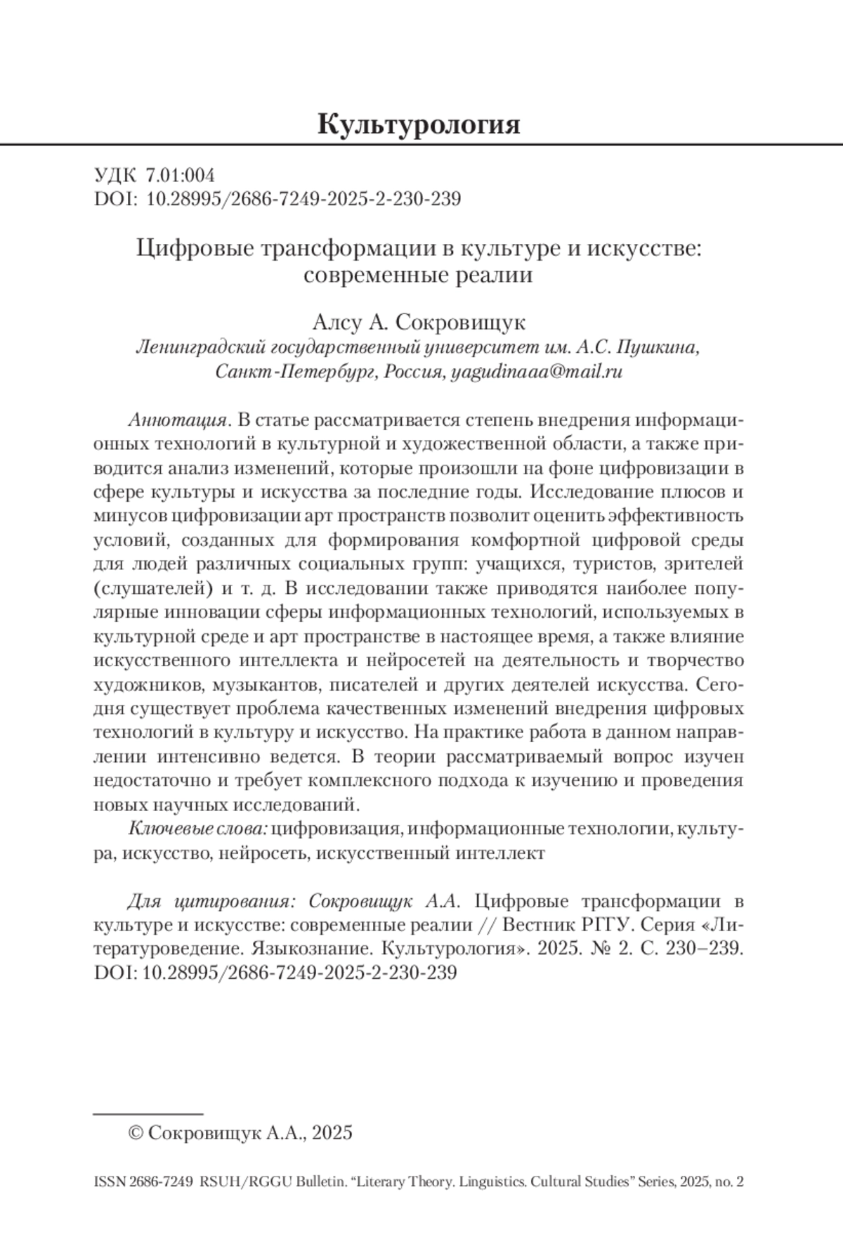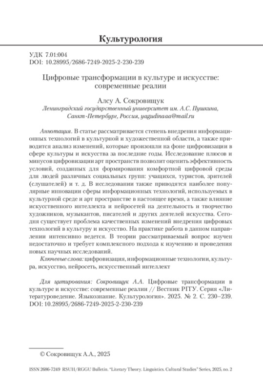 СОКРОВИЩУК А. А. ЦИФРОВЫЕ ТРАНСФОРМАЦИИ В КУЛЬТУРЕ И ИСКУССТВЕ: СОВРЕМЕННЫЕ РЕАЛИИ // ВЕСТНИК РГГУ. СЕРИЯ «ЛИТЕРАТУРОВЕДЕНИЕ. ЯЗЫКОЗНАНИЕ. КУЛЬТУРОЛОГИЯ». 2025. № 2