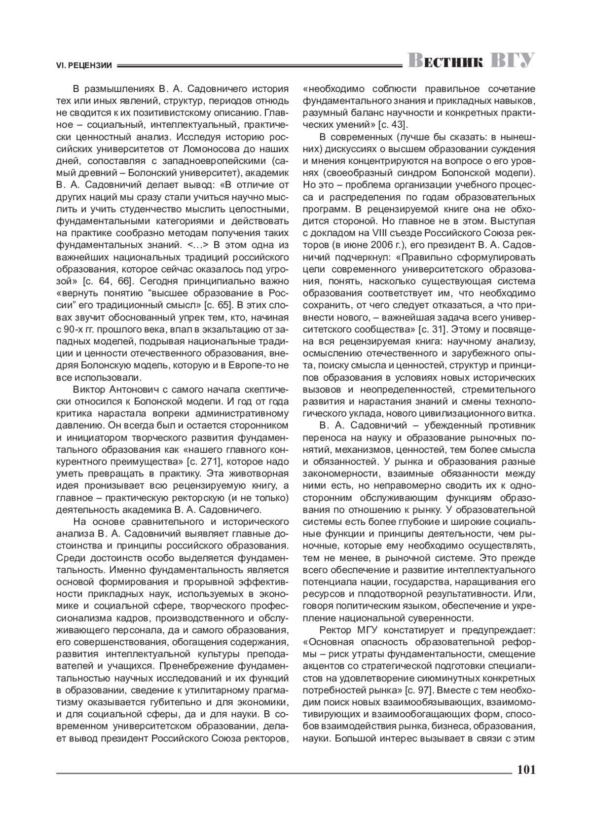 Представлена рецензия на сборник избранных выступлений ректора Московского государственного университета В. А. Садовничего, посвященных актуальным проблемам российского высшего образования. Рецензия содержит анализ проблем, находящихся в центре внимания В. А. Садовничего, его размышлений об образовании, в которых он предстает как ученый, педагог, общественный деятель.