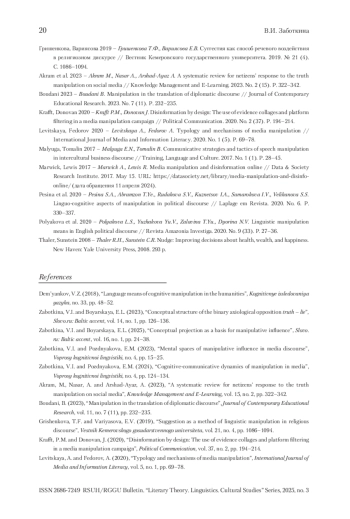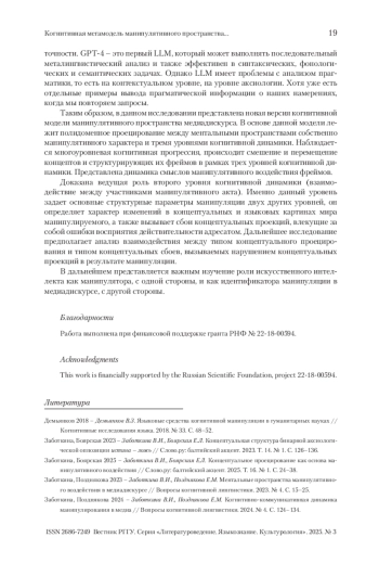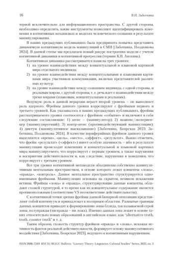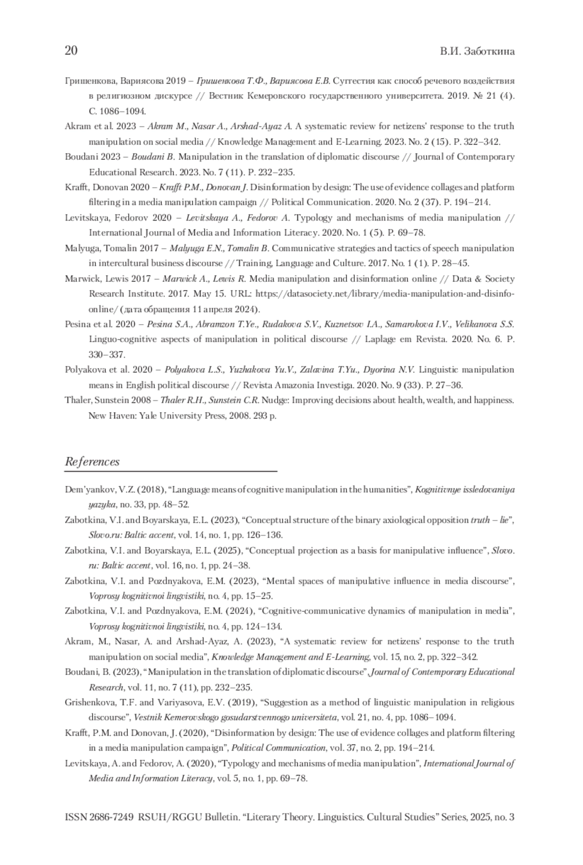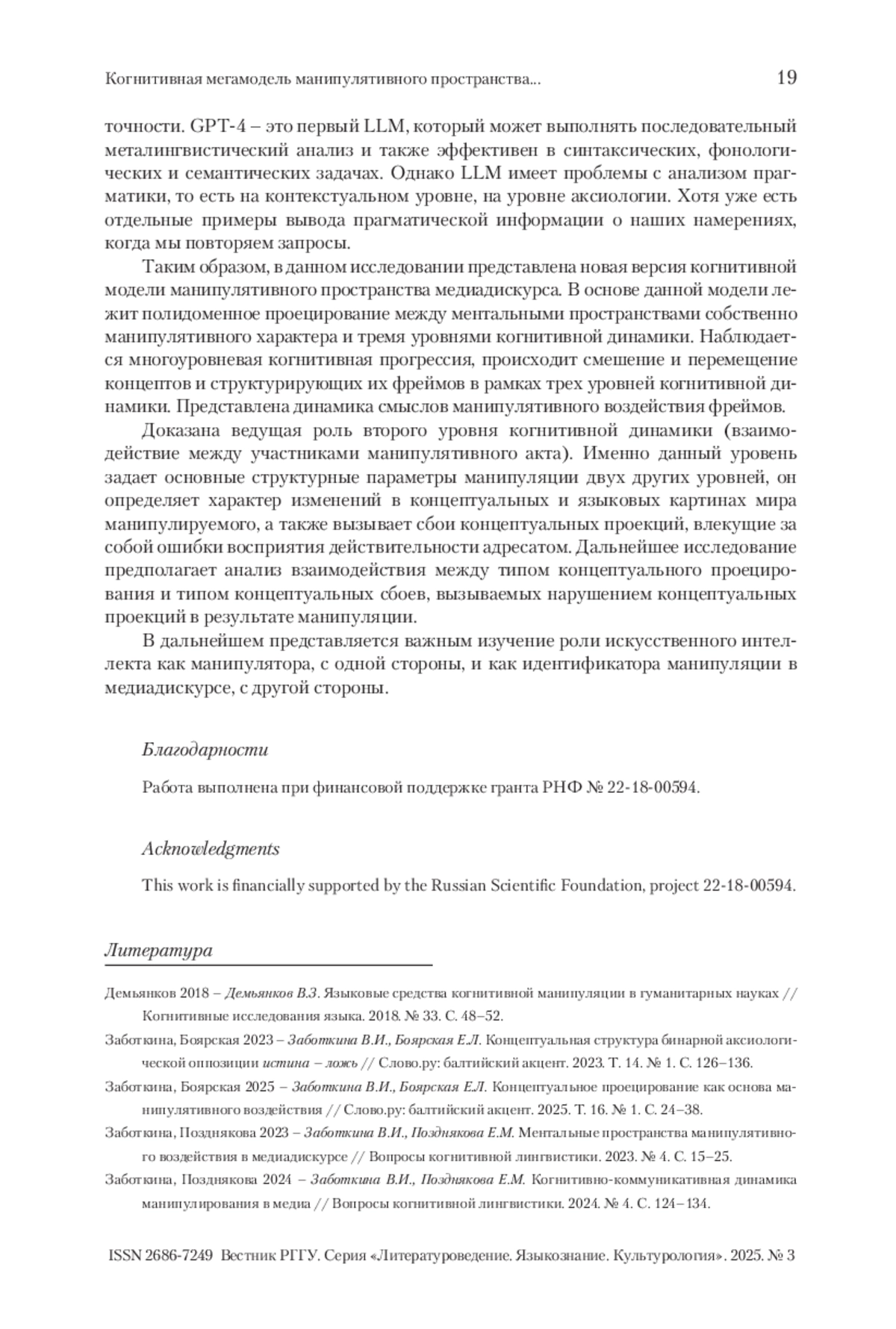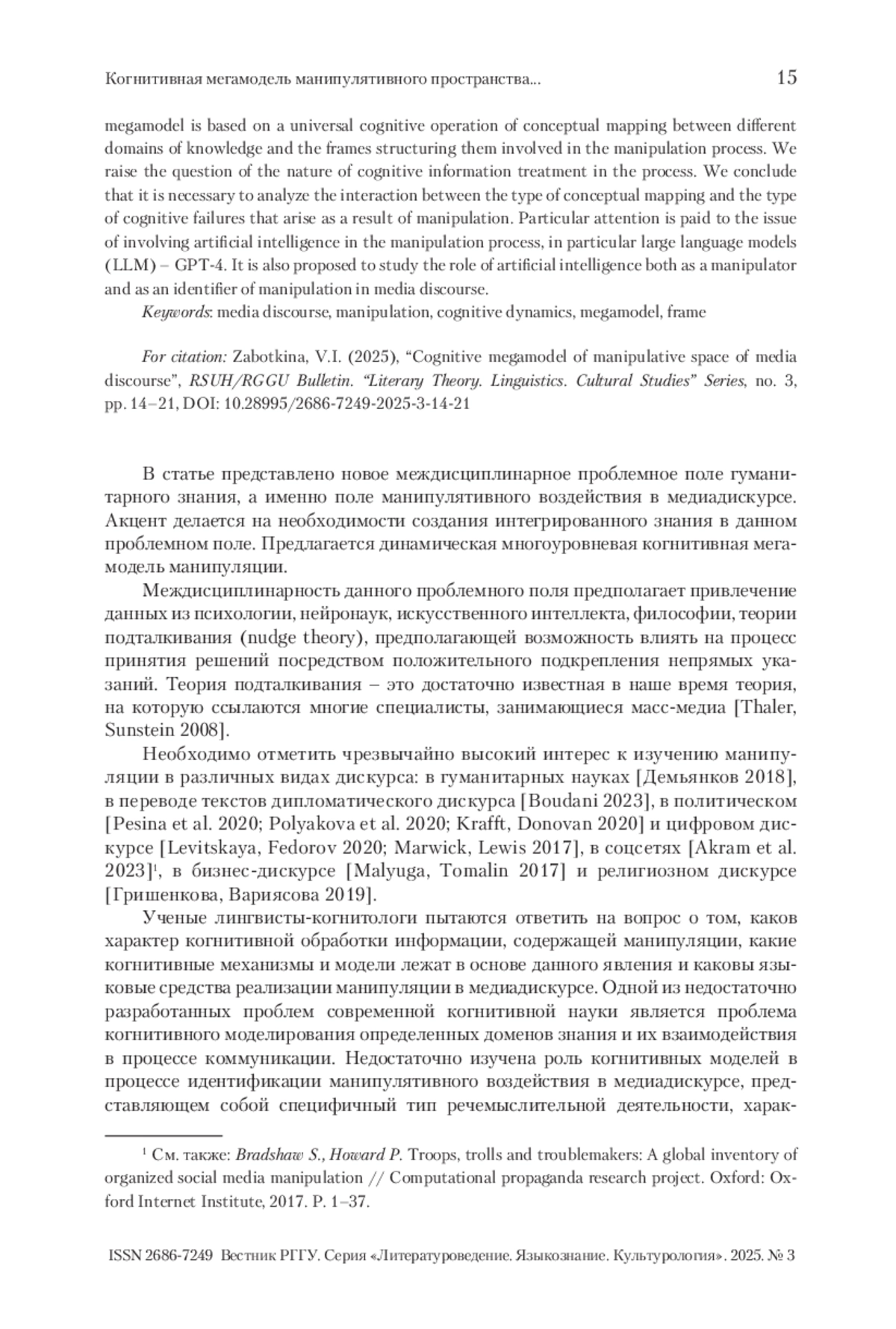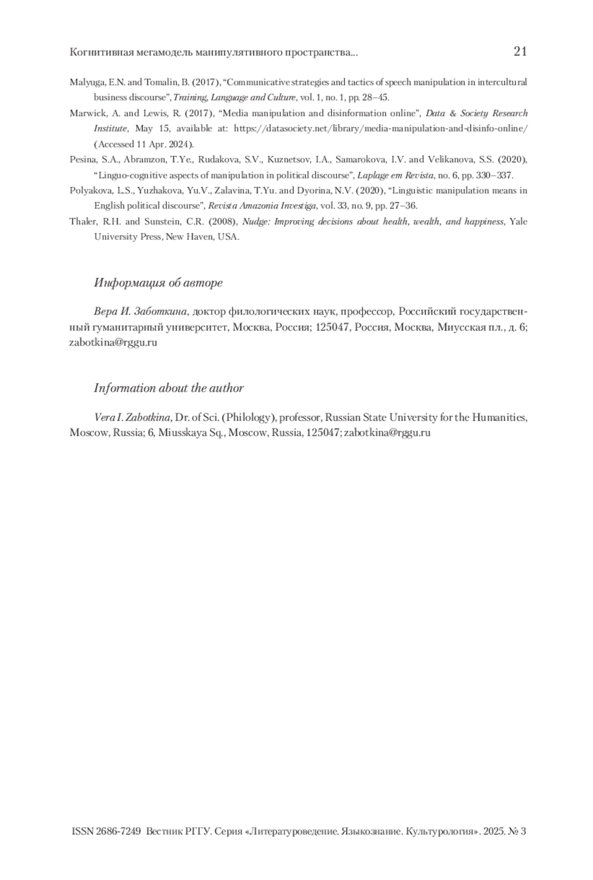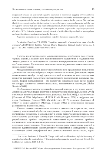 ЗАБОТКИНА В. И. КОГНИТИВНАЯ МЕГАМОДЕЛЬ МАНИПУЛЯТИВНОГО ПРОСТРАНСТВА МЕДИАДИСКУРСА // ВЕСТНИК РГГУ. СЕРИЯ «ЛИТЕРАТУРОВЕДЕНИЕ. ЯЗЫКОЗНАНИЕ. КУЛЬТУРОЛОГИЯ». 2025. № 3
