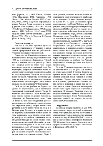 Эта работа – результат орнитологической поездки в 2000 г. по Восточному и Центральному Алтаю, в частности, по восточной окраине плато Укок. Путь в 200 км по долине Тархаты, на плато, по рекам Тара и Елангаш через Южно-Чуйский хребет занял 27 дней. Всего найдено 97 видов птиц, из которых, вероятно, только два не гнездятся в этом районе. Признаки гнездования или пребывания в гнездовой период отмечены для Falco columbarius, Porzana porzana, Asio otus, Anthus godlewskii, Locustella certhiola, Acrocephalus dumetorum и Hippolais caligata. Семь видов из Красной книги Республики Алтай: Gavia arctica, Ciconia nigra, Cygnus cygnus, Buteo hemilasius, Aquila chrysaetos, Grus virgo и Leucosticte brandti. Многие виды можно было наблюдать здесь на верхней границе их распространения на Алтае, а также на южной или северной окраине их гнездового ареала. Представлены сонограммы пения и позывок Locustella certhiola, Hippolais caligata, Uragus sibiricus и Leucosticte arctoa.