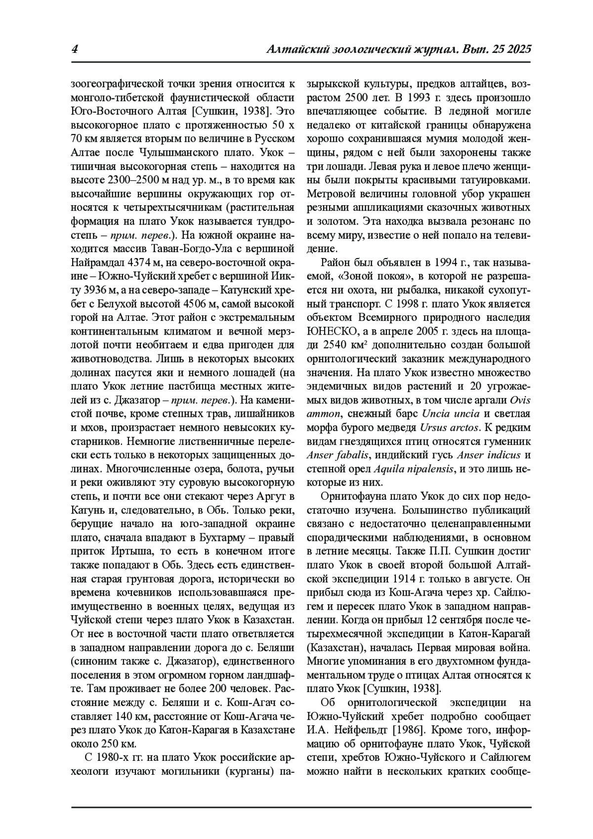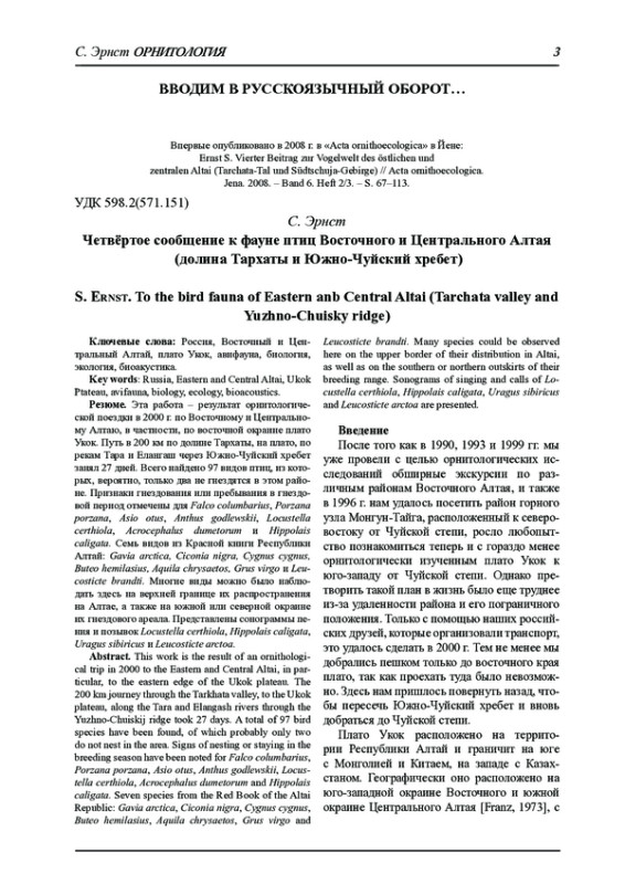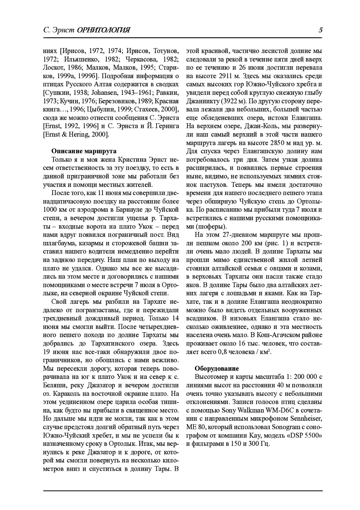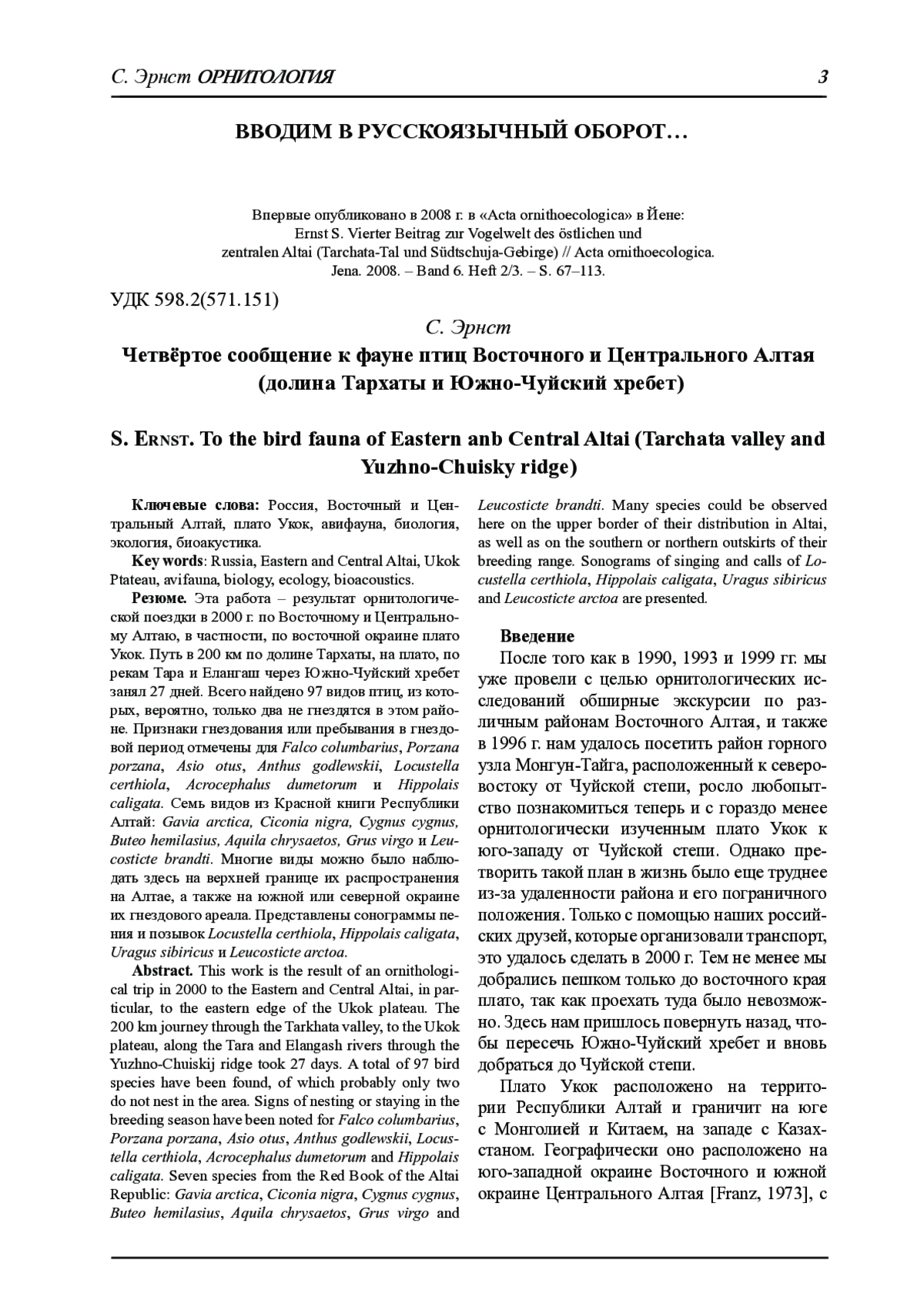 ЭРНСТ С. ЧЕТВЁРТОЕ СООБЩЕНИЕ К ФАУНЕ ПТИЦ ВОСТОЧНОГО И ЦЕНТРАЛЬНОГО АЛТАЯ (ДОЛИНА ТАРХАТЫ И ЮЖНО-ЧУЙСКИЙ ХРЕБЕТ) // АЛТАЙСКИЙ ЗООЛОГИЧЕСКИЙ ЖУРНАЛ. 2025. № 25