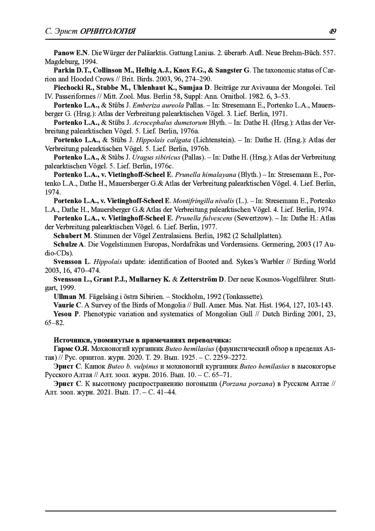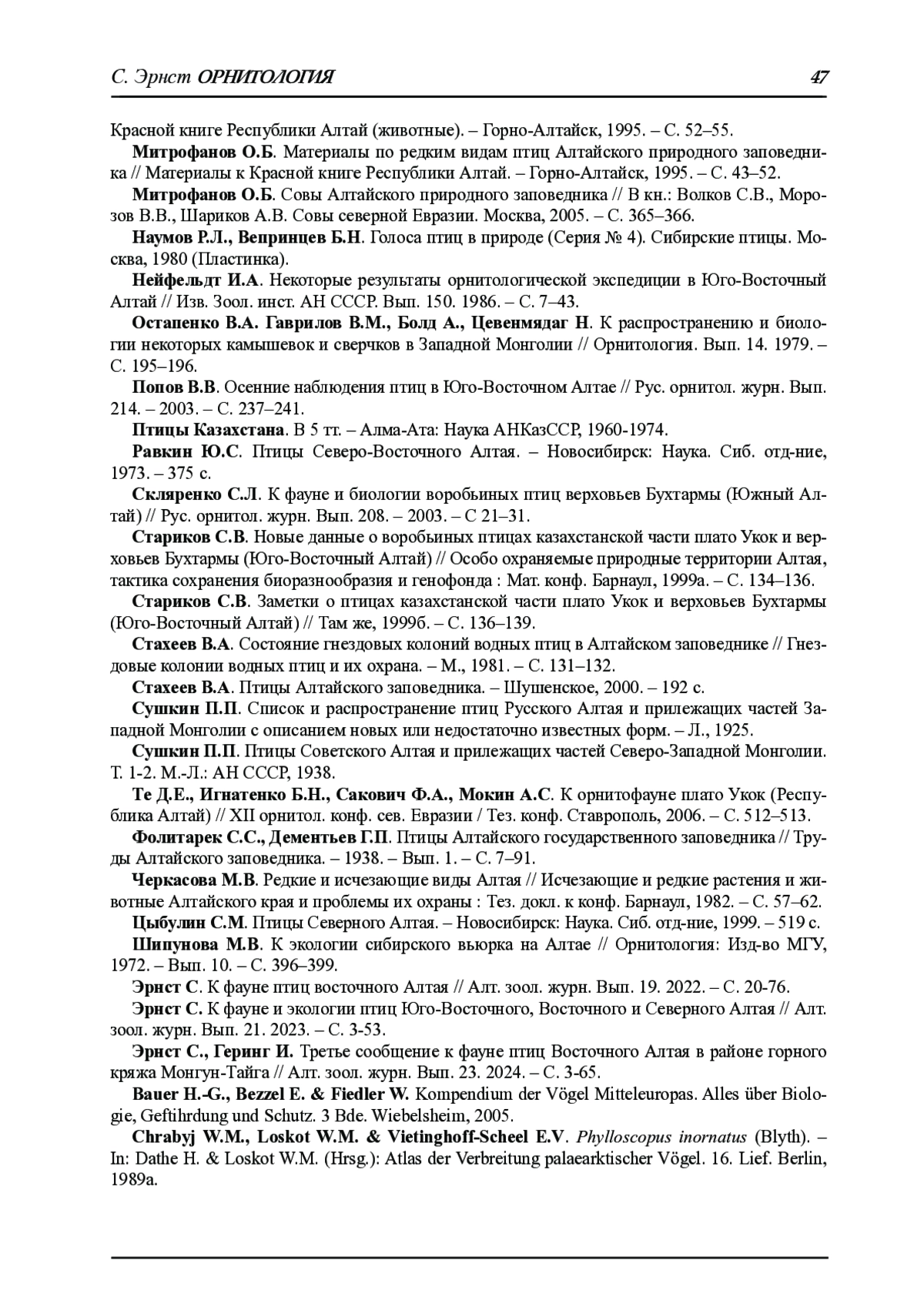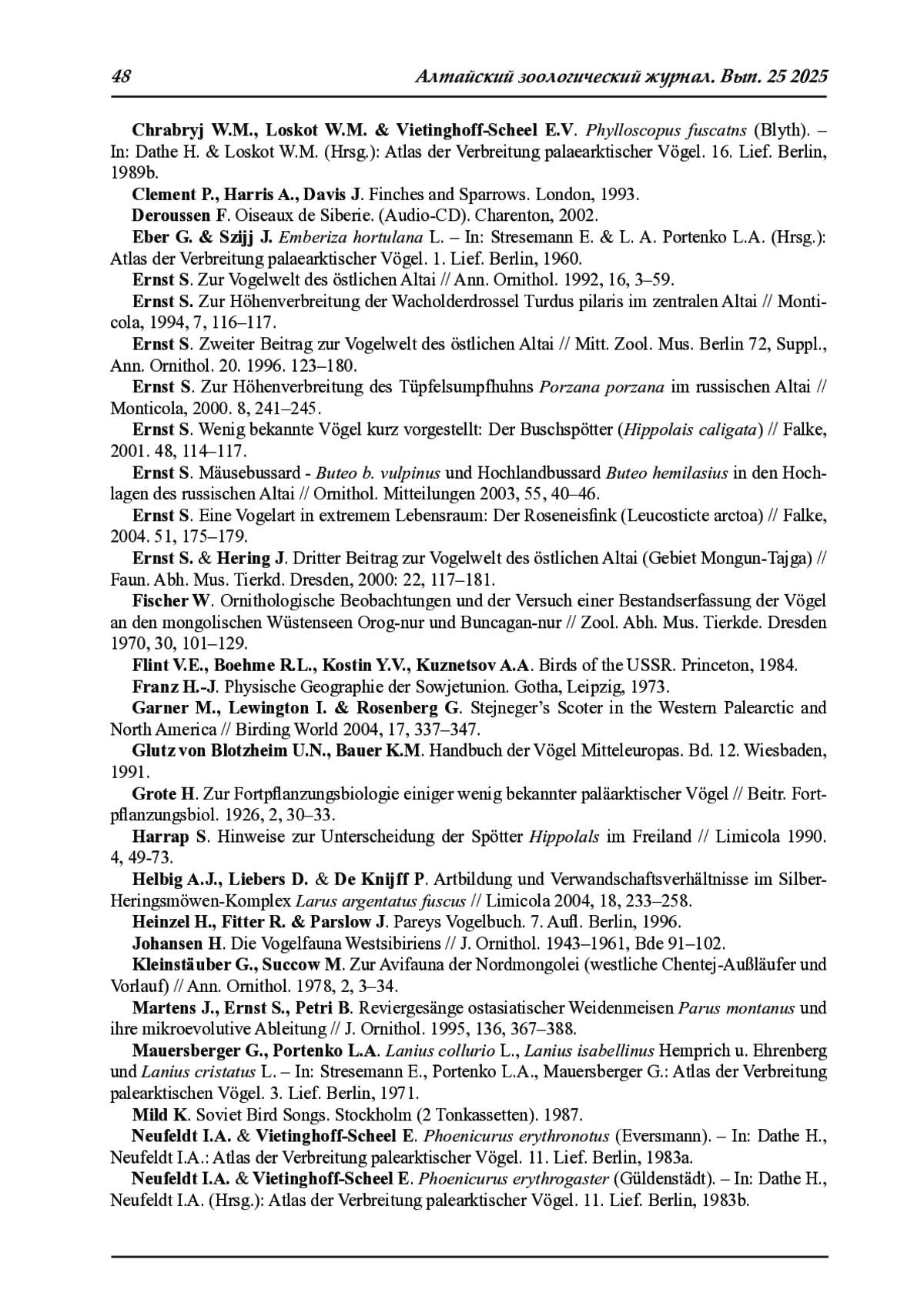 ЭРНСТ С. ЧЕТВЁРТОЕ СООБЩЕНИЕ К ФАУНЕ ПТИЦ ВОСТОЧНОГО И ЦЕНТРАЛЬНОГО АЛТАЯ (ДОЛИНА ТАРХАТЫ И ЮЖНО-ЧУЙСКИЙ ХРЕБЕТ) // АЛТАЙСКИЙ ЗООЛОГИЧЕСКИЙ ЖУРНАЛ. 2025. № 25