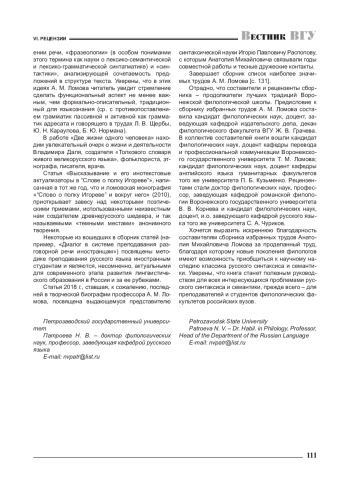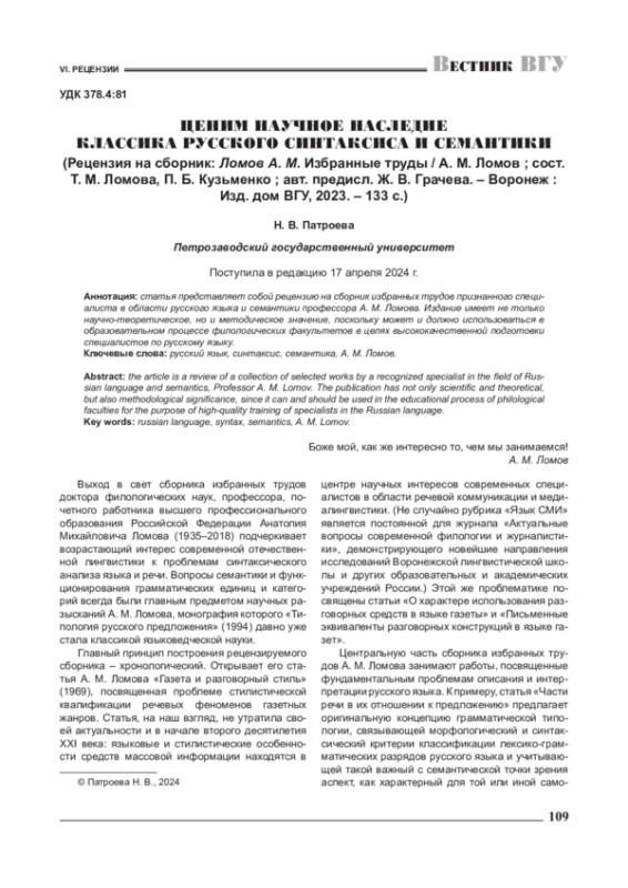 ПАТРОЕВА Н. В. ЦЕНИМ НАУЧНОЕ НАСЛЕДИЕ КЛАССИКА РУССКОГО СИНТАКСИСА И СЕМАНТИКИ (РЕЦЕНЗИЯ НА СБОРНИК: ЛОМОВ А. М. ИЗБРАННЫЕ ТРУДЫ / А. М. ЛОМОВ; СОСТ. Т. М. ЛОМОВА, П. Б. КУЗЬМЕНКО; АВТ. ПРЕДИСЛ. Ж. В. ГРАЧЕВА. - ВОРОНЕЖ: ИЗД. ДОМ ВГУ, 2023. - 133 С.) // ВЕСТНИК ВОРОНЕЖСКОГО ГОСУДАРСТВЕННОГО УНИВЕРСИТЕТА. СЕРИЯ: ПРОБЛЕМЫ ВЫСШЕГО ОБРАЗОВАНИЯ. 2024. № 2
