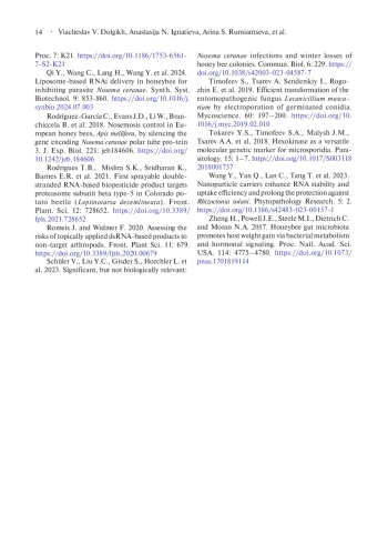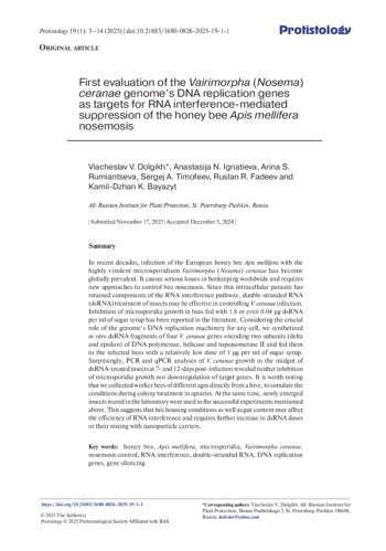 20. McGruddy R.A., Smeele Z.E., Manley B., Masucci J.D. et al. 2024. RNA interference as a next-generation control method for suppressing Varroa destructor reproduction in honey bee (Apis mellifera) hives. Pest. Manag. Sci. 80: 4770-4778. DOI: 10.1002/ps.8193