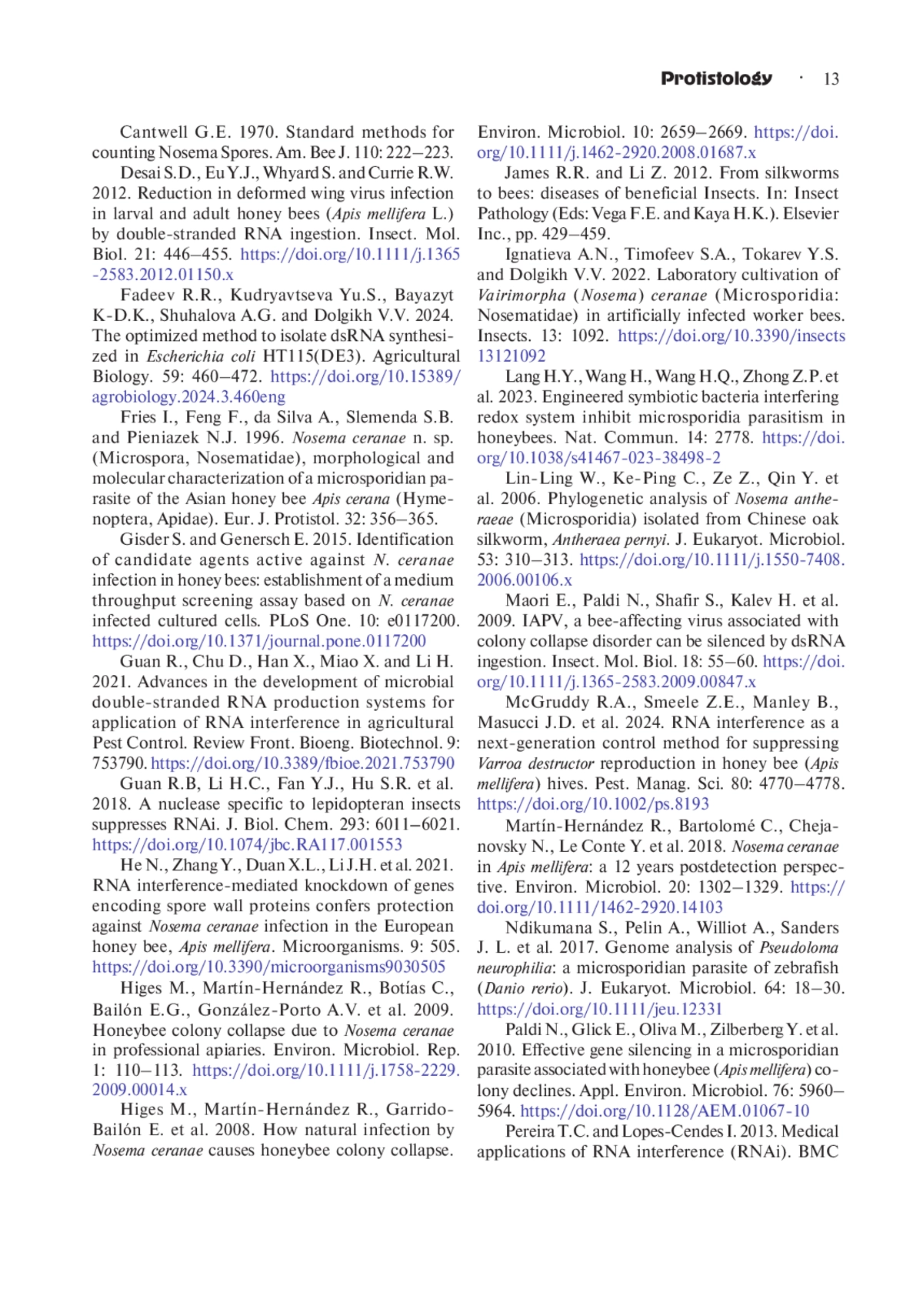 21. Martín-Hernández R., Bartolomé C., Chejanovsky N., Le Conte Y. et al. 2018. Nosema ceranae in Apis mellifera: a 12 years postdetection perspective. Environ. Microbiol. 20: 1302-1329. DOI: 10.1111/1462-2920.14103