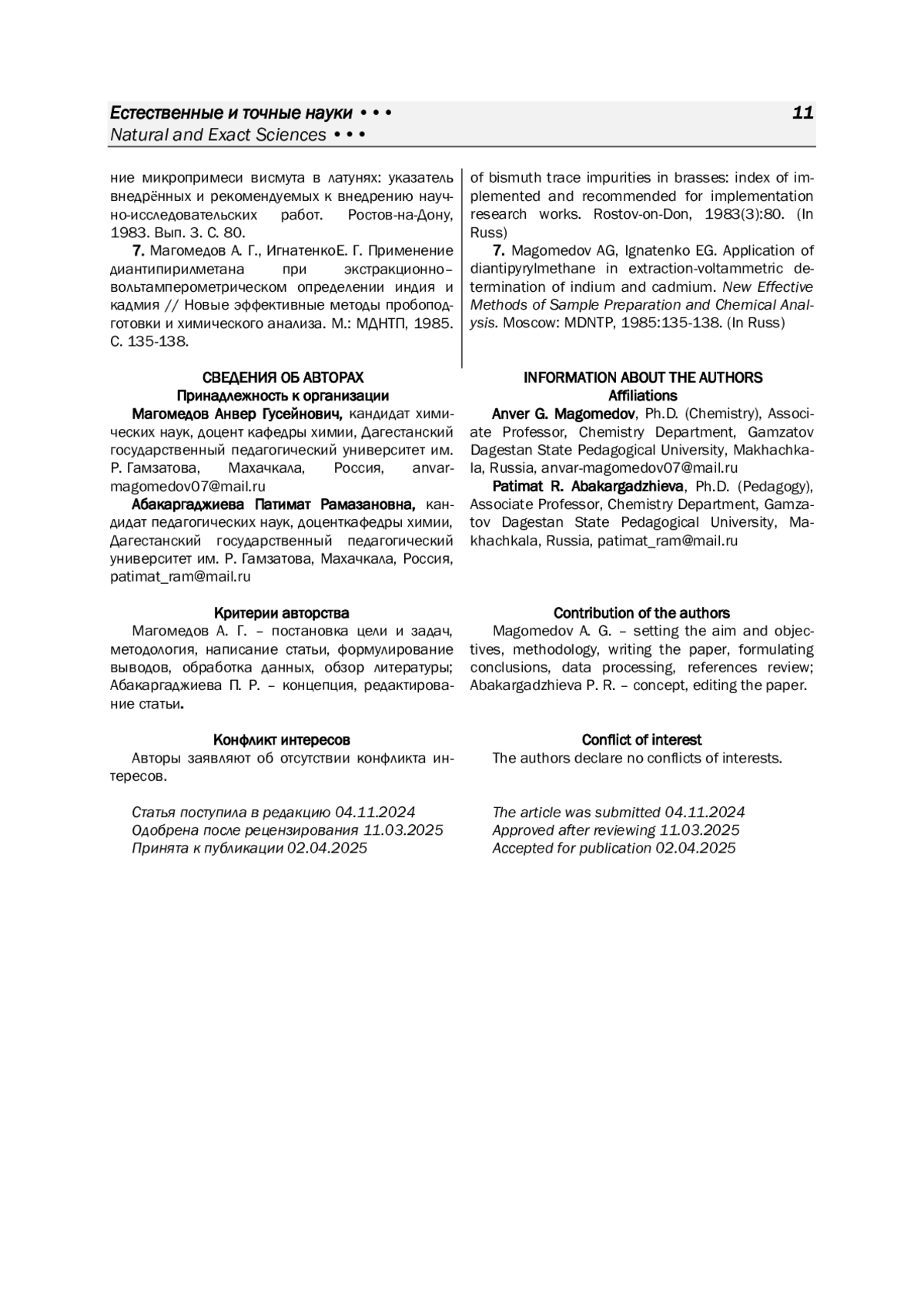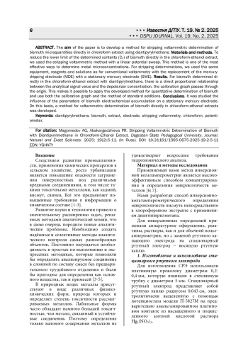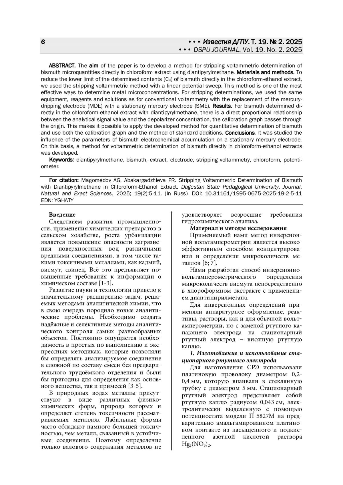 МАГОМЕДОВ А. Г., АБАКАРГАДЖИЕВА П. Р. ИНВЕРСИОННОЕ ВОЛЬТАМПЕРОМЕТРИЧЕСКОЕ ОПРЕДЕЛЕНИЕ ВИСМУТА С ДИАНТИПИРИЛМЕТАНОМ В ХЛОРОФОРМНО-ЭТАНОЛЬНОМ ЭКСТРАКТЕ // ИЗВЕСТИЯ ДАГЕСТАНСКОГО ГОСУДАРСТВЕННОГО ПЕДАГОГИЧЕСКОГО УНИВЕРСИТЕТА. ЕСТЕСТВЕННЫЕ И ТОЧНЫЕ НАУКИ. 2025. № 2, ТОМ 19