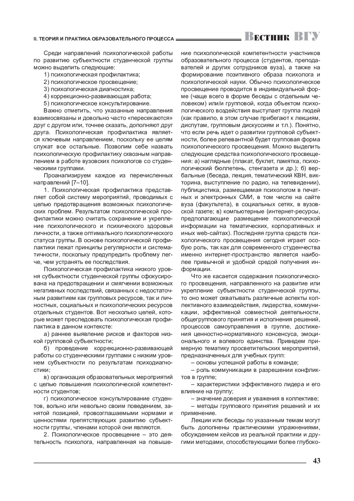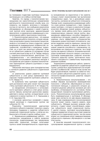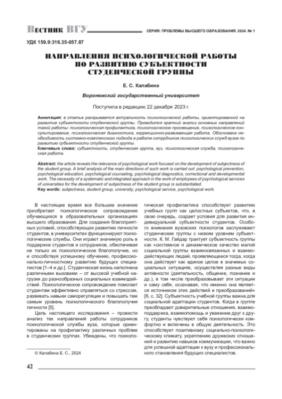 В статье раскрывается актуальность психологической работы, ориентированной на развитие субъектности студенческой группы. Проводится краткий анализ основных направлений такой работы: психологическая профилактика, психологическое просвещение, психологическое консультирование, психологическая диагностика, коррекционно-развивающая работа. Обоснована необходимость системно-комплексного подхода в работе сотрудников психологических служб вузов по развитию субъектности студенческой группы.