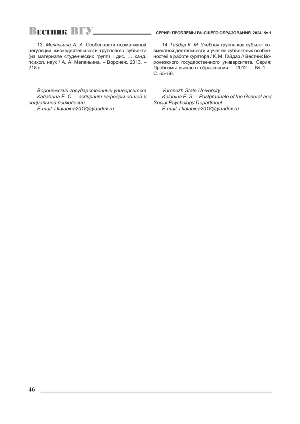 13. Меланьина А. А. Особенности нормативной регуляции жизнедеятельности группового субъекта (на материале студенческих групп): дис.. канд. психол. наук / А. А. Меланьина. - Воронеж, 2013. -218 с. EDN: SUSBUR