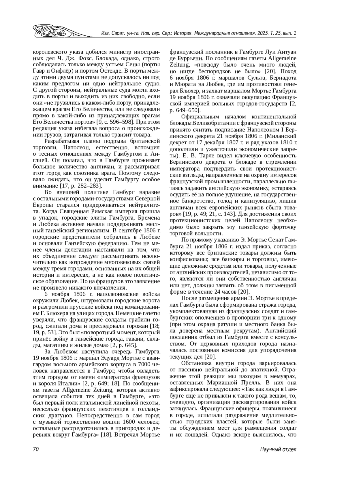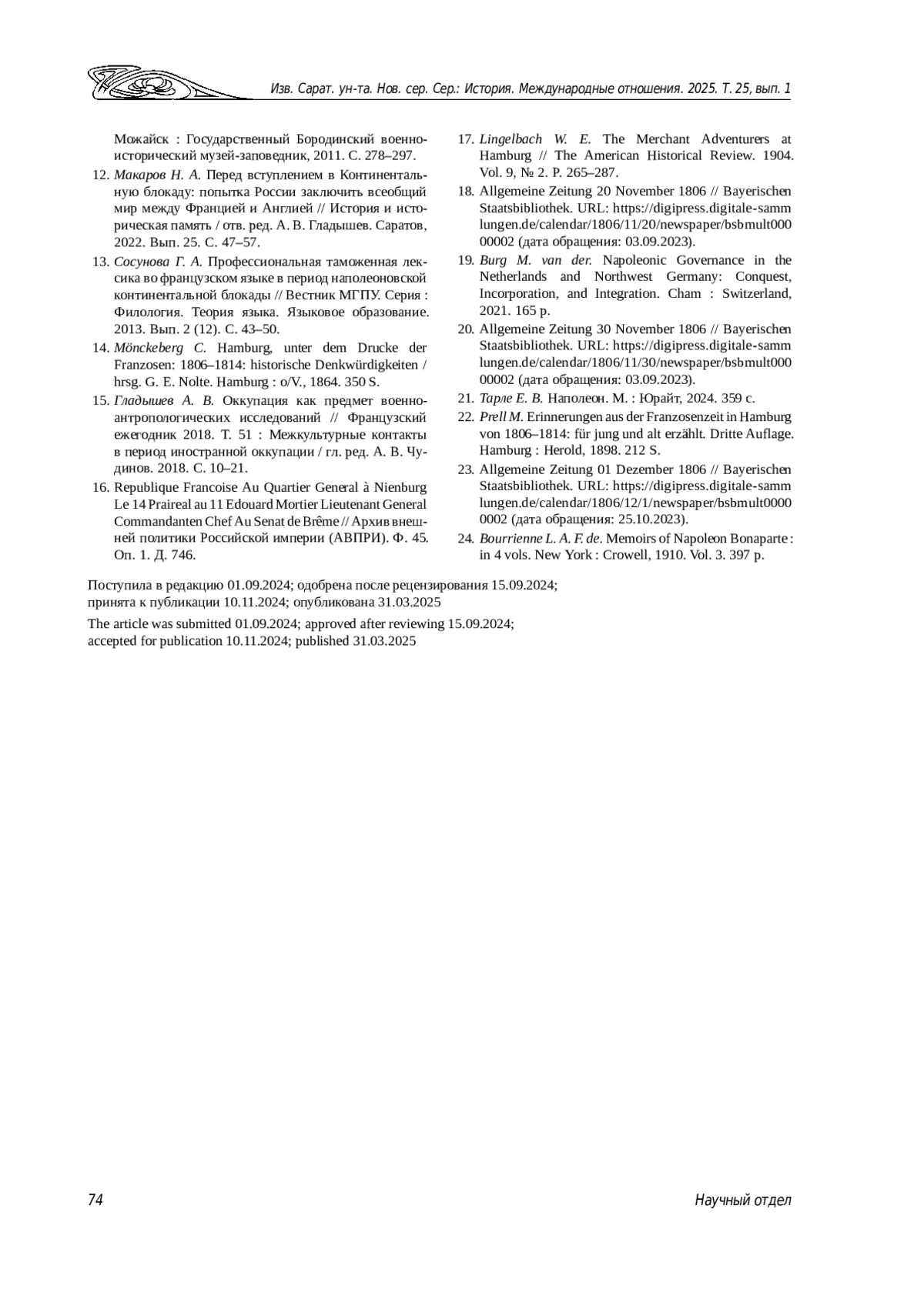 12. Макаров Н. А. Перед вступлением в Континентальную блокаду: попытка России заключить всеобщий мир между Францией и Англией // История и историческая память / отв. ред. А. В. Гладышев. Саратов, 2022. Вып. 25. С. 47-57. EDN: UKIGLY
