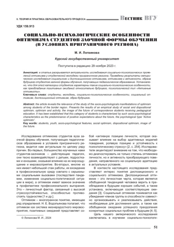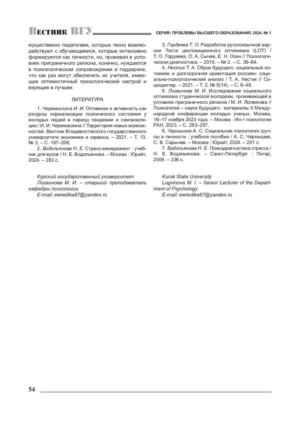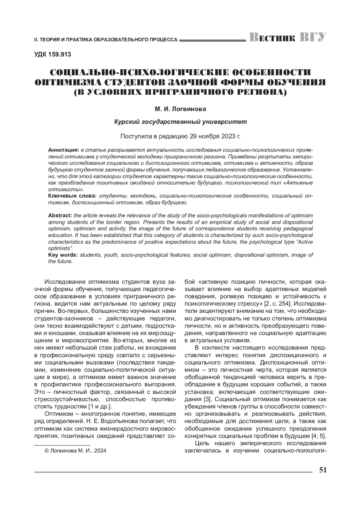 5. Логвинова М. И. Исследование социального оптимизма студенческой молодежи, проживающей в условиях приграничного региона / М. И. Логвинова // Психология - наука будущего: материалы X Международной конференции молодых ученых, Москва, 16-17 ноября 2023 года. - Москва: Ин-т психологии РАН, 2023. - С. 293-297. EDN: IRDNUF