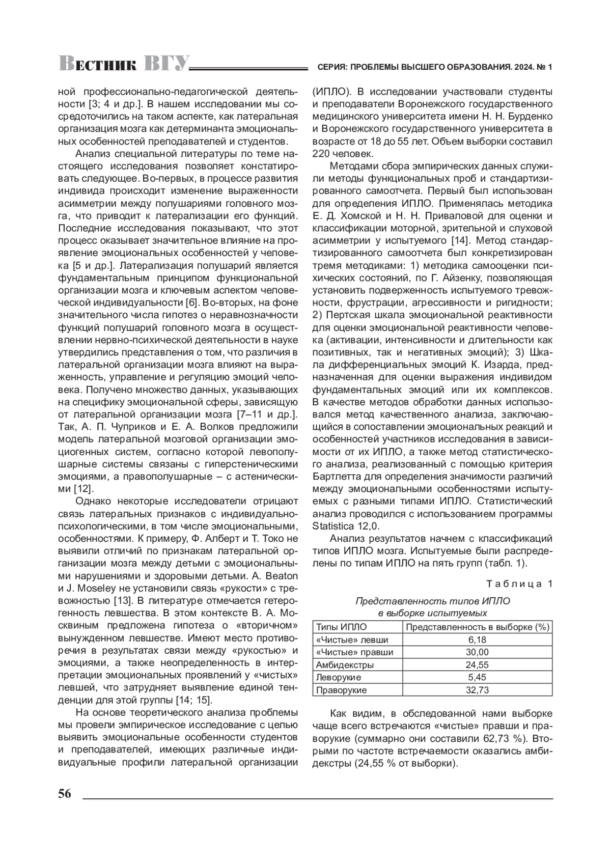 15. Пятых И. К. Сравнительное исследование темперамента правшей и левшей / И. К. Пятых // Образование и наука. - 2011. - № 10(89). - С. 59-67. EDN: OKKQTP