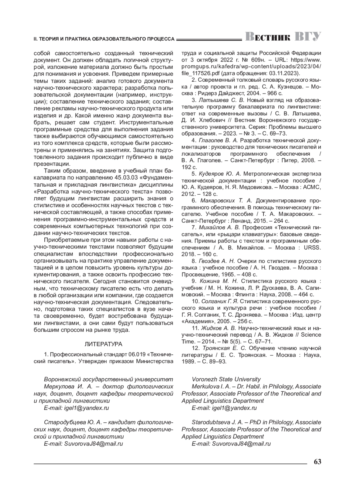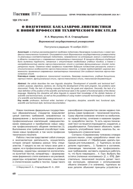 В статье рассматривается проблема подготовки бакалавров лингвистики к новой профессии технического писателя. Описывается опыт Воронежского государственного университета по реализации соответствующей подготовки, направленной на интеграцию знаний и компетенций в области лингвистики и современных компьютерных технологий. В процессе обучения студентов были выявлены трудности, связанные с отсутствием необходимых учебных пособий, а также с неопределенностью места научно-технического стиля в системе функциональных стилей литературного языка. Освоение новой профессии позволяет будущим лингвистам расширить знания о стилистических особенностях научно-технических текстов, а также предоставляет широкие возможности применения современных компьютерных технологий для создания текстов научно-технического стиля.