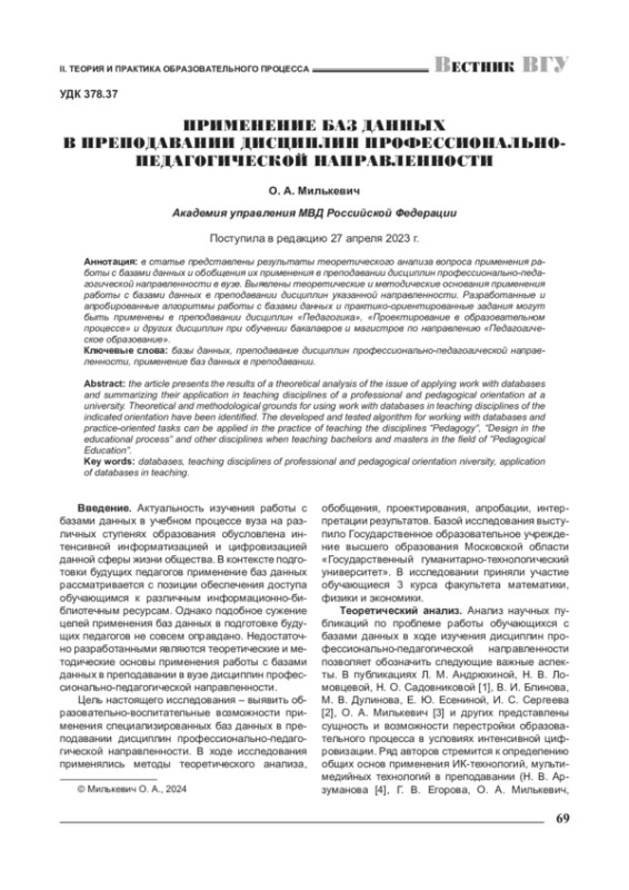 В статье представлены результаты теоретического анализа вопроса применения работы с базами данных и обобщения их применения в преподавании дисциплин профессионально-педагогической направленности в вузе. Выявлены теоретические и методические основания применения работы с базами данных в преподавании дисциплин указанной направленности. Разработанные и апробированные алгоритмы работы с базами данных и практико-ориентированные задания могут быть применены в преподавании дисциплин «Педагогика», «Проектирование в образовательном процессе» и других дисциплин при обучении бакалавров и магистров по направлению «Педагогическое образование».