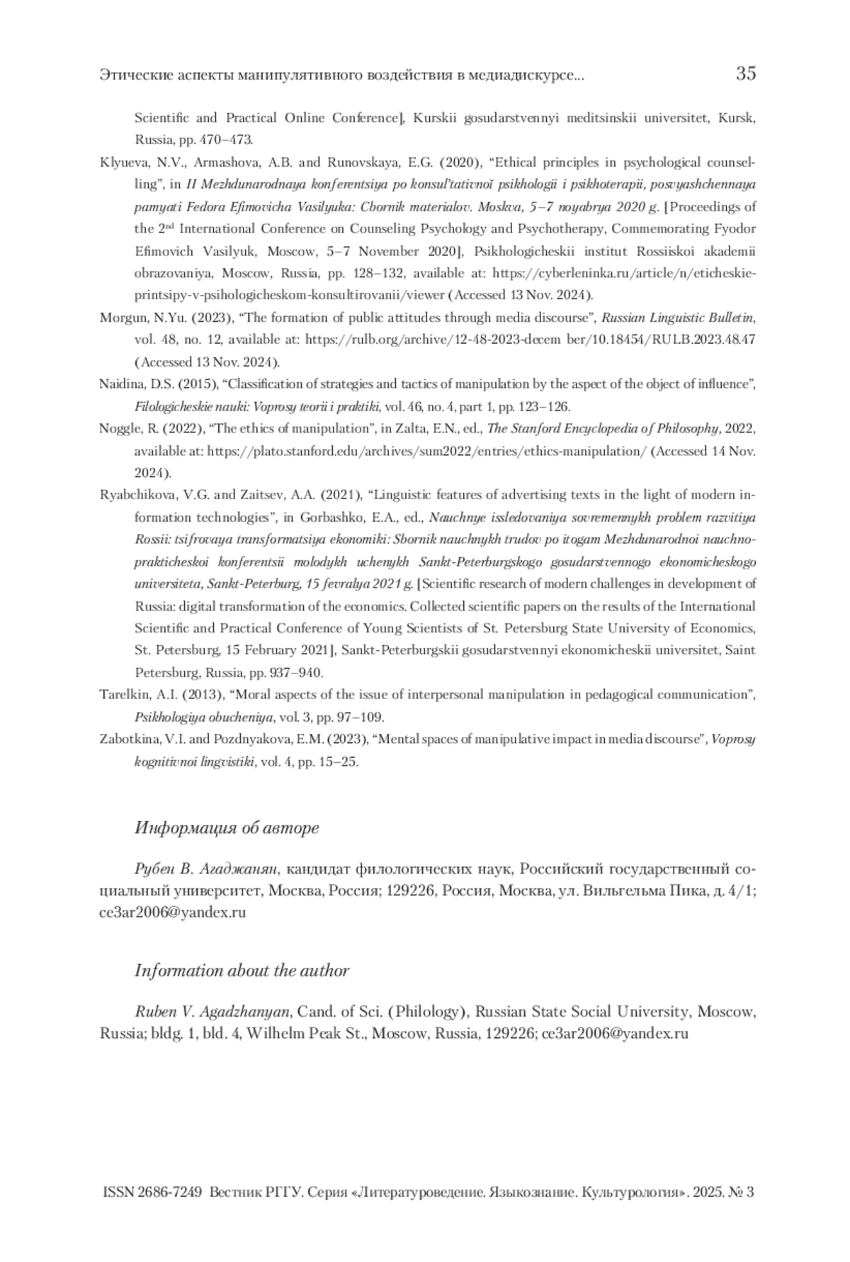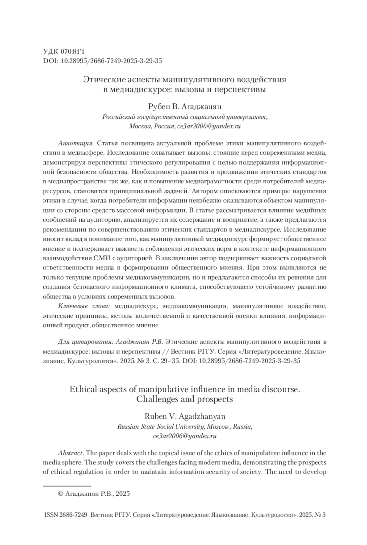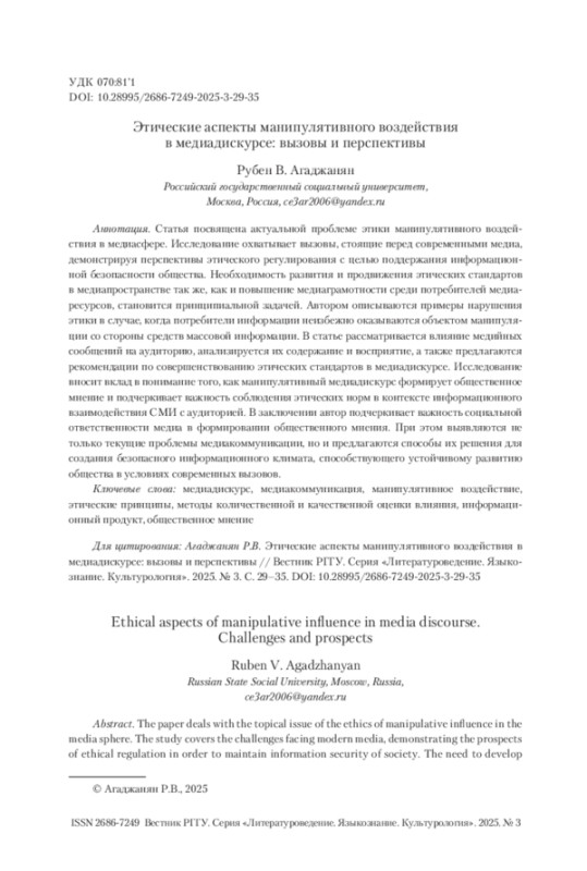 АГАДЖАНЯН Р. В. ЭТИЧЕСКИЕ АСПЕКТЫ МАНИПУЛЯТИВНОГО ВОЗДЕЙСТВИЯ В МЕДИАДИСКУРСЕ: ВЫЗОВЫ И ПЕРСПЕКТИВЫ // ВЕСТНИК РГГУ. СЕРИЯ «ЛИТЕРАТУРОВЕДЕНИЕ. ЯЗЫКОЗНАНИЕ. КУЛЬТУРОЛОГИЯ». 2025. № 3