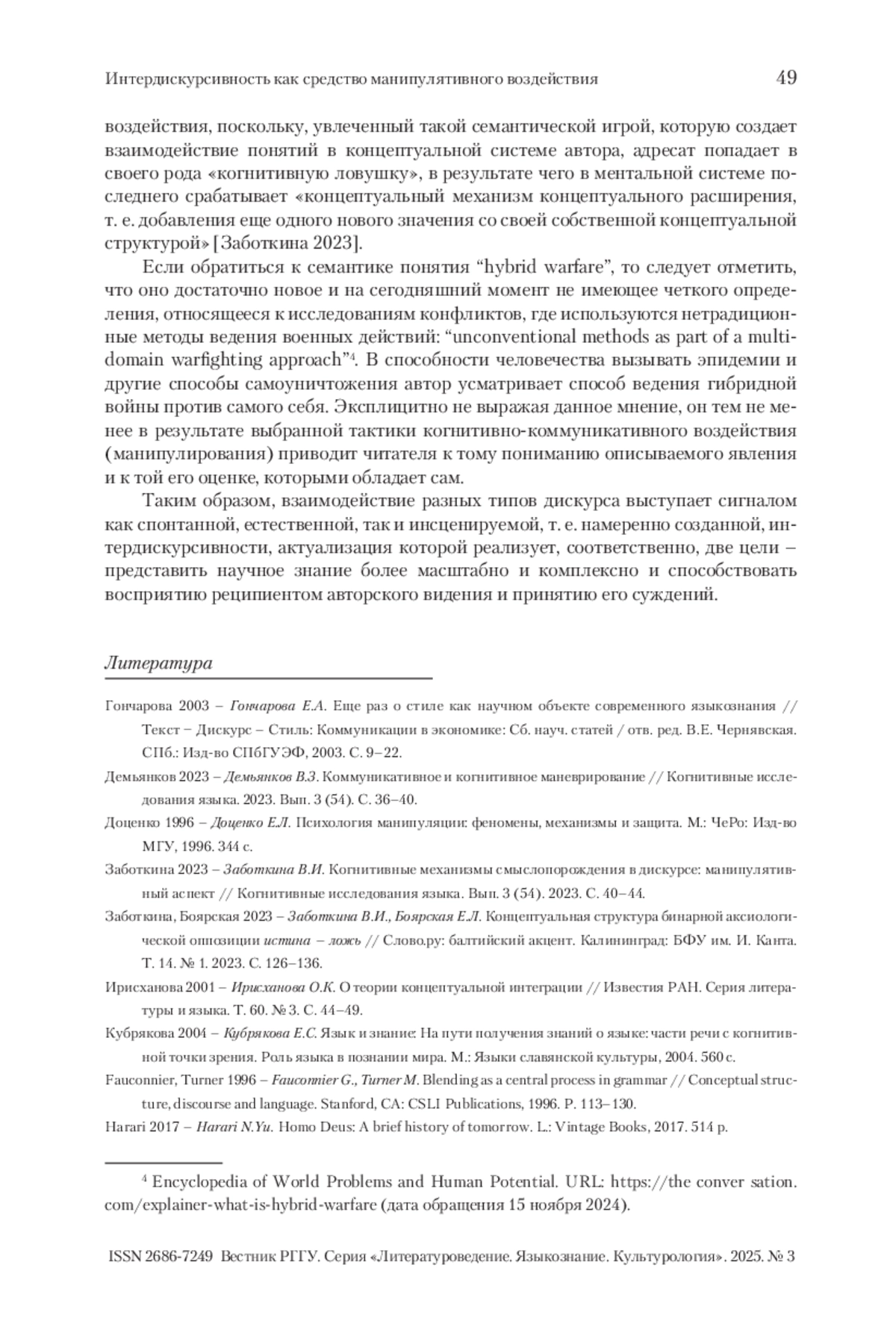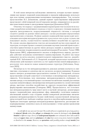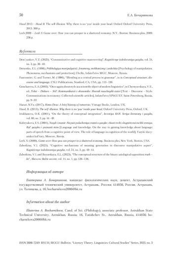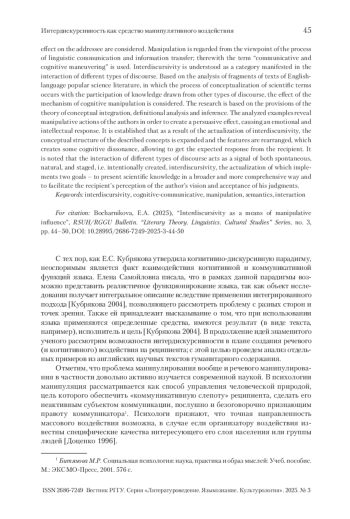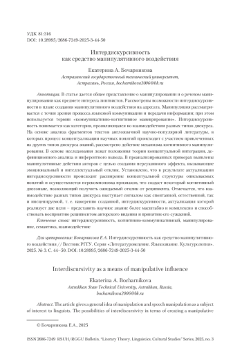 БОЧАРНИКОВА Е. А. ИНТЕРДИСКУРСИВНОСТЬ КАК СРЕДСТВО МАНИПУЛЯТИВНОГО ВОЗДЕЙСТВИЯ // ВЕСТНИК РГГУ. СЕРИЯ «ЛИТЕРАТУРОВЕДЕНИЕ. ЯЗЫКОЗНАНИЕ. КУЛЬТУРОЛОГИЯ». 2025. № 3